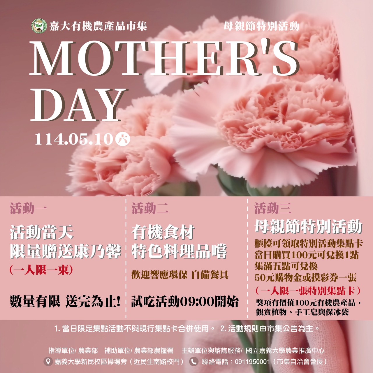 國立嘉義大學有機市集母親節優惠活動,歡迎踴躍參加