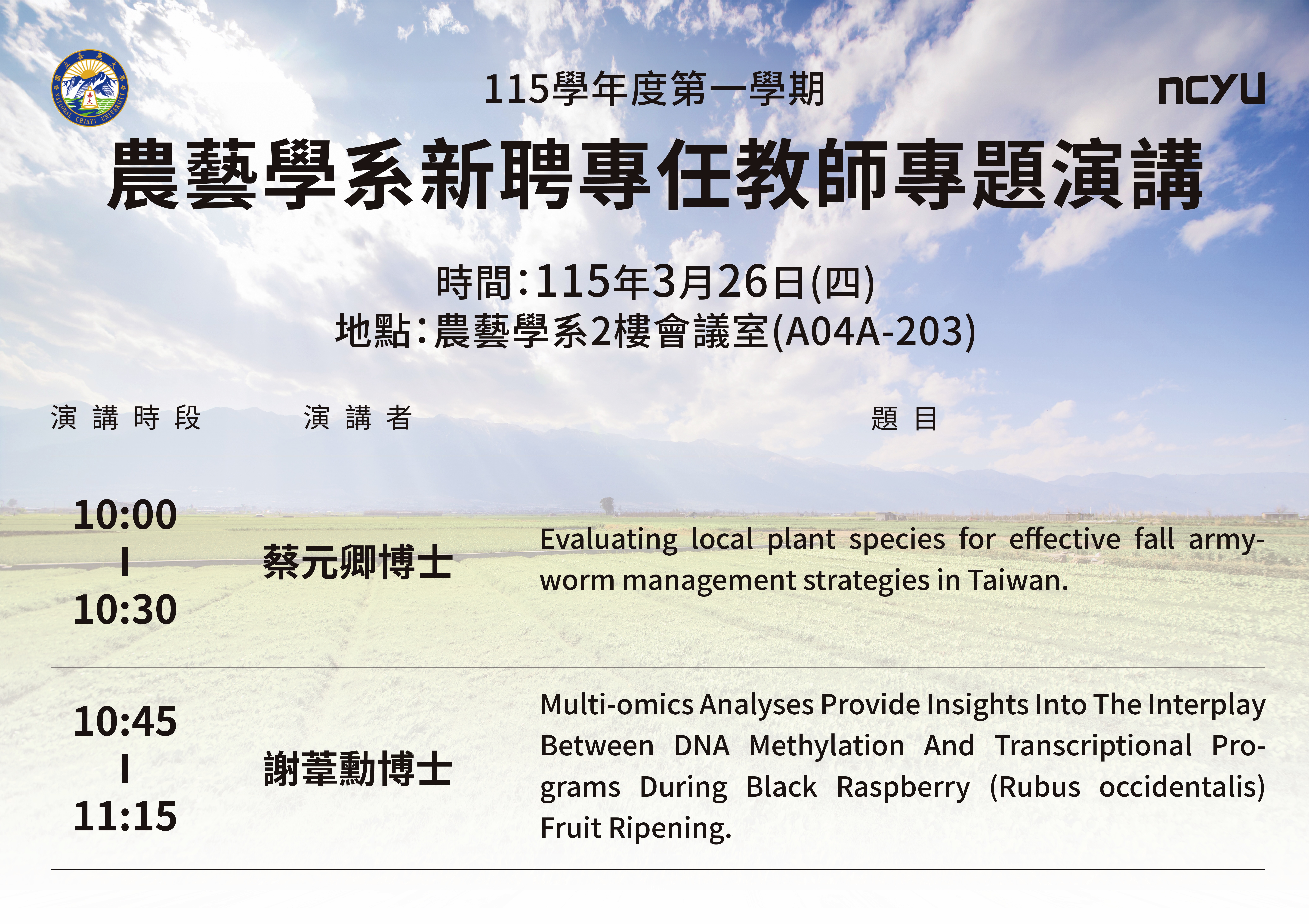 | 2026/03/17 | 公告 | 農藝學系115學年度新聘專任教師專題演講 | 農藝學系暨研究所 |
