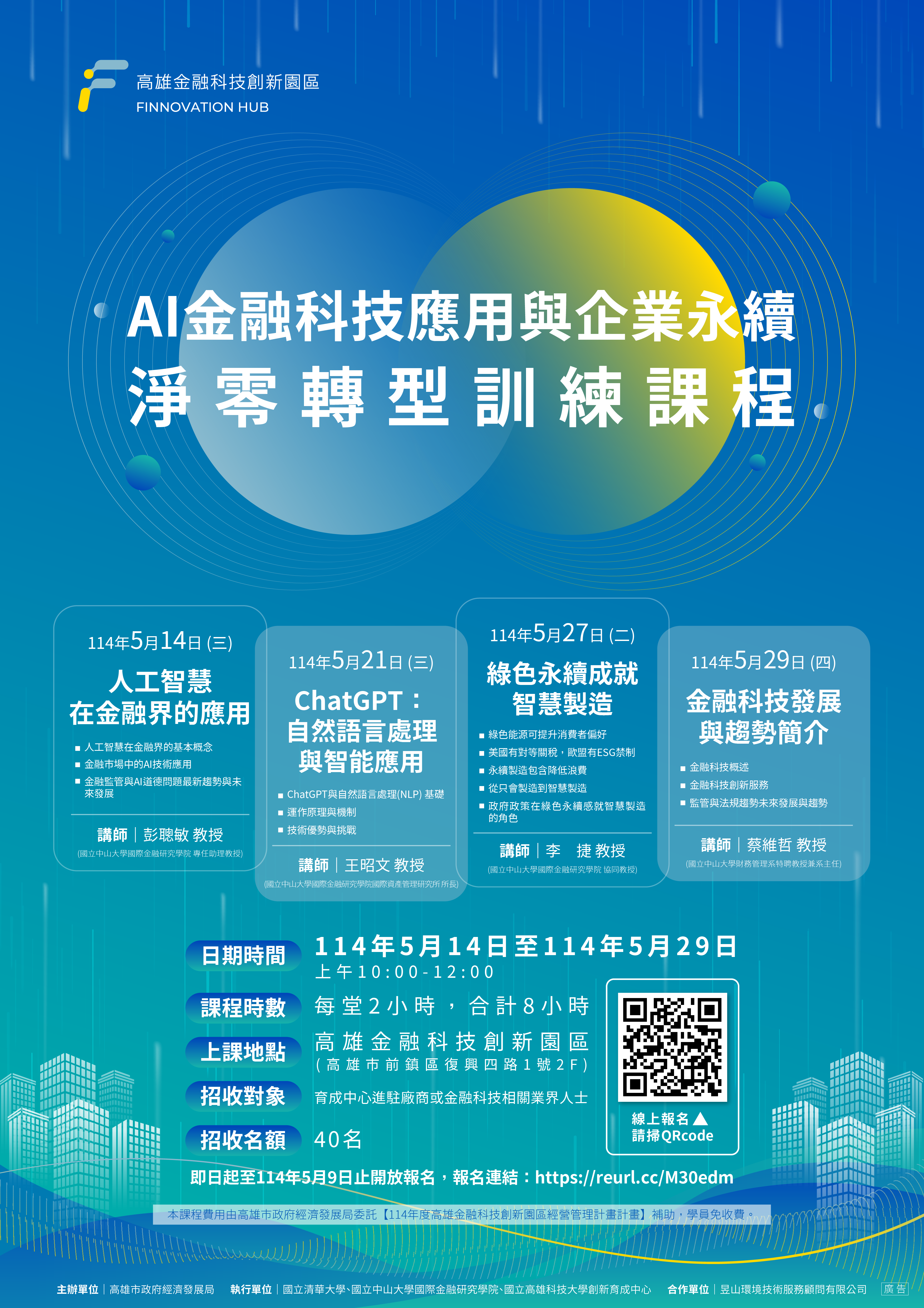 二、首場安排於114年5月推出【AI金融科技應用與企業永續淨零轉型訓練課程】,分為四次授課,分別介紹人工智慧在金融界的應用、ChatGPT自然語言處理與智能應用、綠色永續成就智慧製造以及金融科技發展與趨勢簡介。