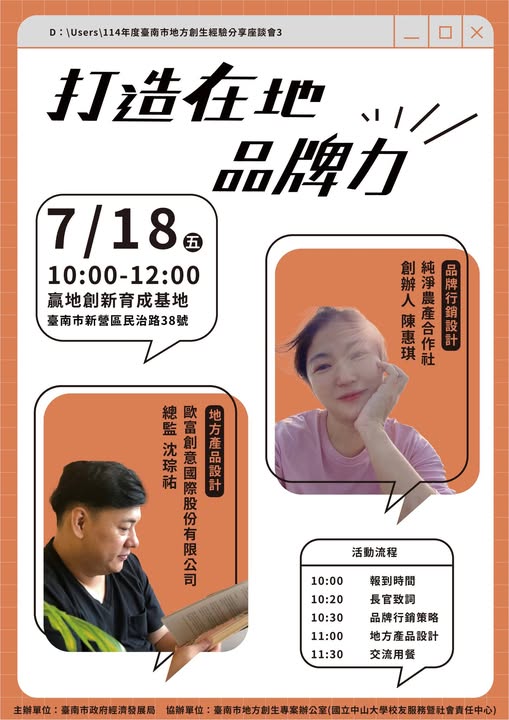 二、旨揭活動謹訂於114年7月18日上午10時假贏地創新育成基地舉辦,請有意參加者於 7月16日完成線上報名(報名網址:https://reurl.cc/8940ag)。