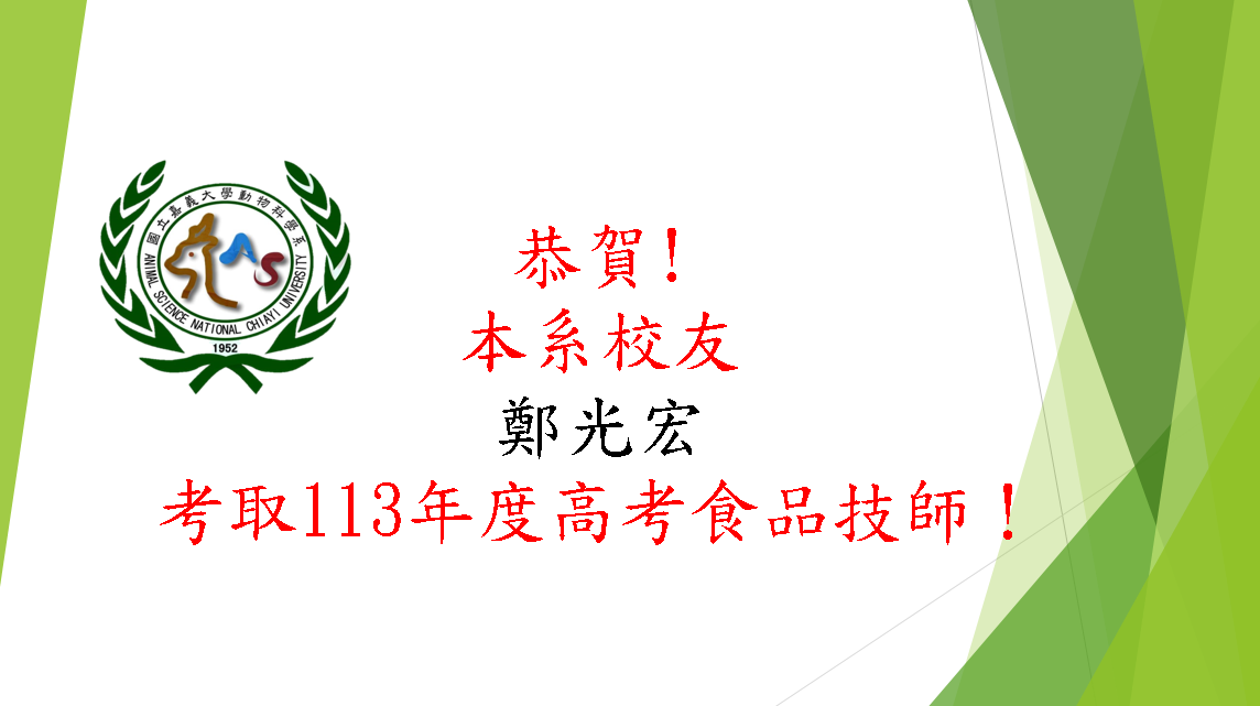 2025/02/19 | 恭賀!本系校友鄭光宏考取113年度專門職業及技術人員高等考試食品技師! | 動物科學系暨研究所 | |