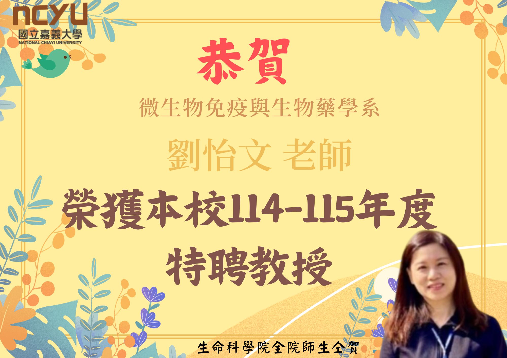 賀!微生物免疫與生物藥學系劉怡文老師,榮獲本校114-115年度特聘教授,全院師生仝賀。
