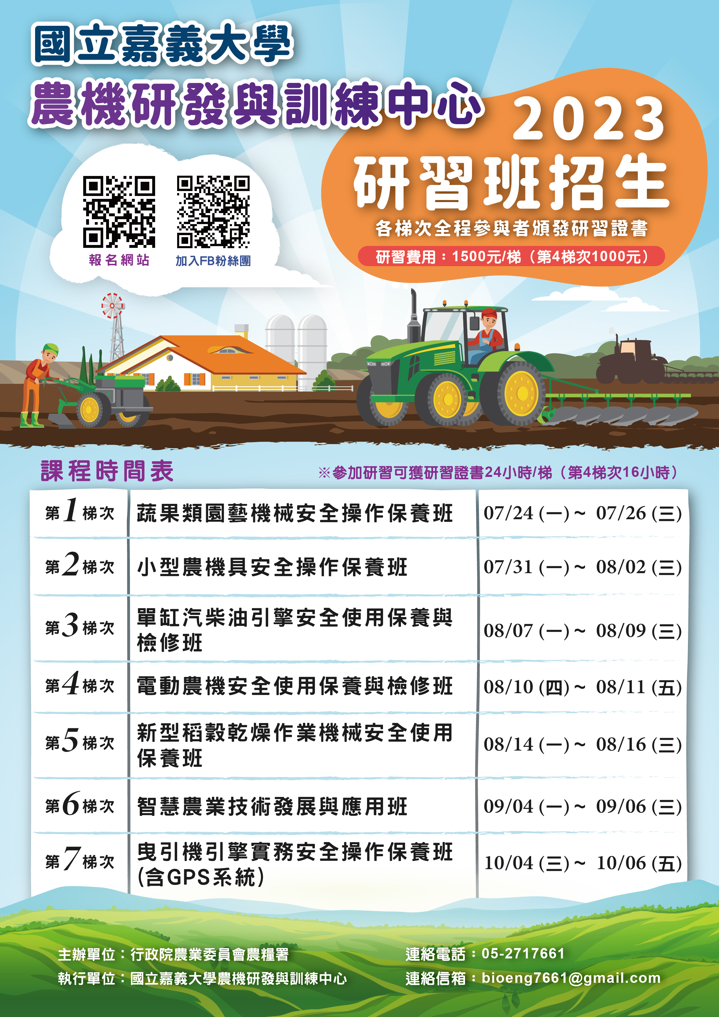 | 2023/05/26 | 通知公告 | 112年「農機操作保養訓練」課程於6月1日開放報名,敬請踴躍報名! | 生物機電工程學系暨研究所 |