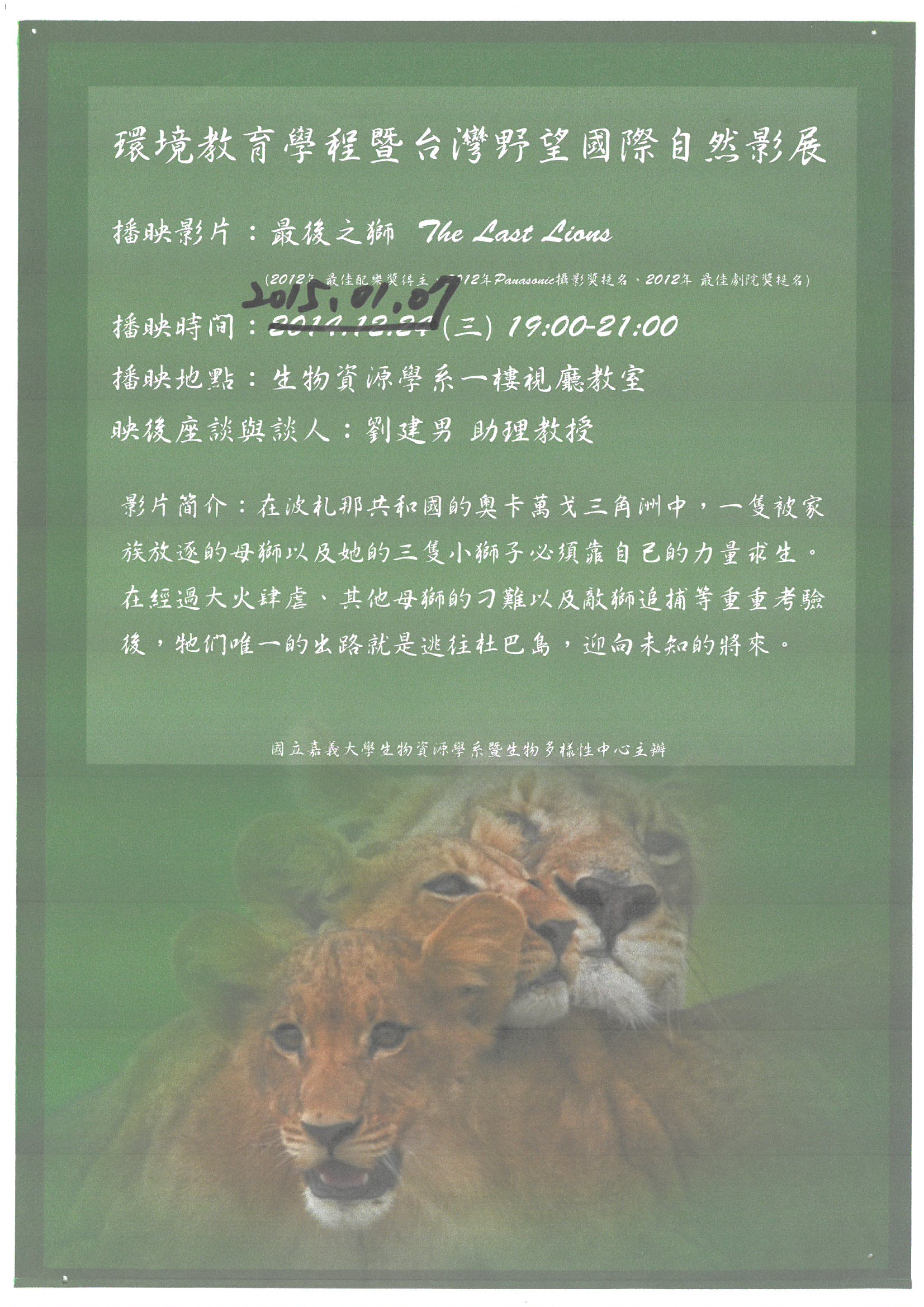 本系103學年度第1學期野望影展-1月7號「最後之獅」,請同學踴躍參加