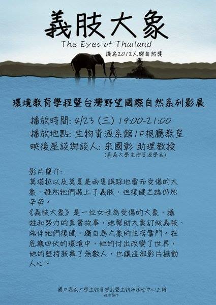本系102學年度第2學期野望影展-4月23號「義肢大象」,請同學踴躍參加