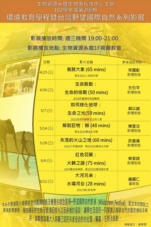 本系102學年度第2學期野望國際自然影展系列,請同學踴躍參加