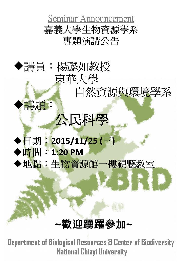 本系104學年度第1學期專題演講-11月25日「運用公民科學協助台灣蛙類保育」,請同學踴躍參加