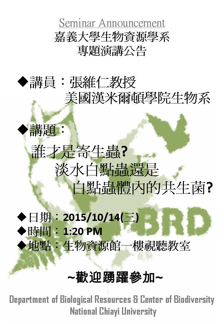 本系104學年度第1學期專題演講-10月14日「誰才是寄生蟲?淡水白點蟲還是白點蟲裡的共生菌」,請同學踴躍參加