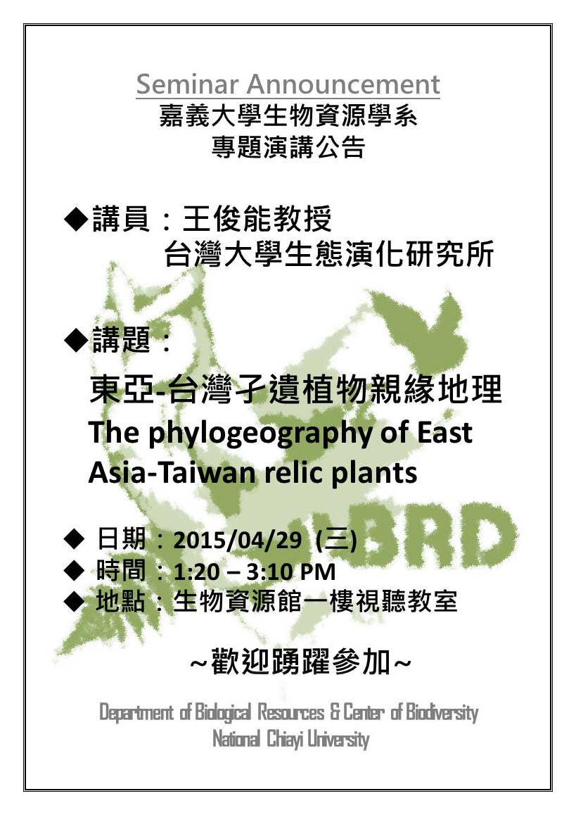 本系103學年度第2學期專題演講-4月29日「東亞-台灣孓遺植物親緣地理」,請同學踴躍參加