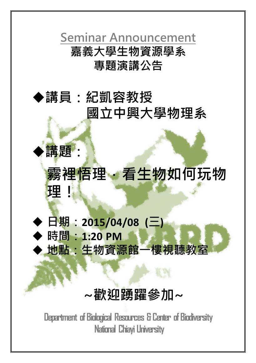 本系103學年度第2學期專題演講-4月8日「霧裡悟理‧看生物如何玩物理」,請同學踴躍參加