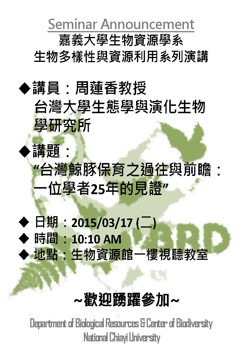 本系103學年度第2學期專題演講-3月17日「“台灣鯨豚保育之過往與前瞻:一位學者25年的見證”」,請同學踴躍參加