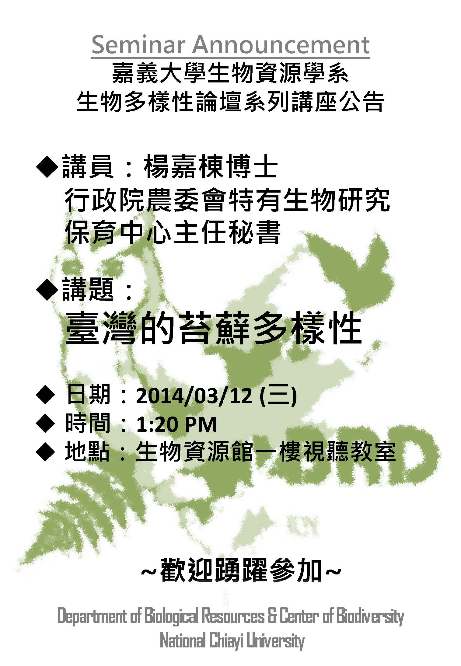 本系102學年度第2學期專題演講-3月12日「臺灣的苔蘚多樣性」,請同學踴躍參加