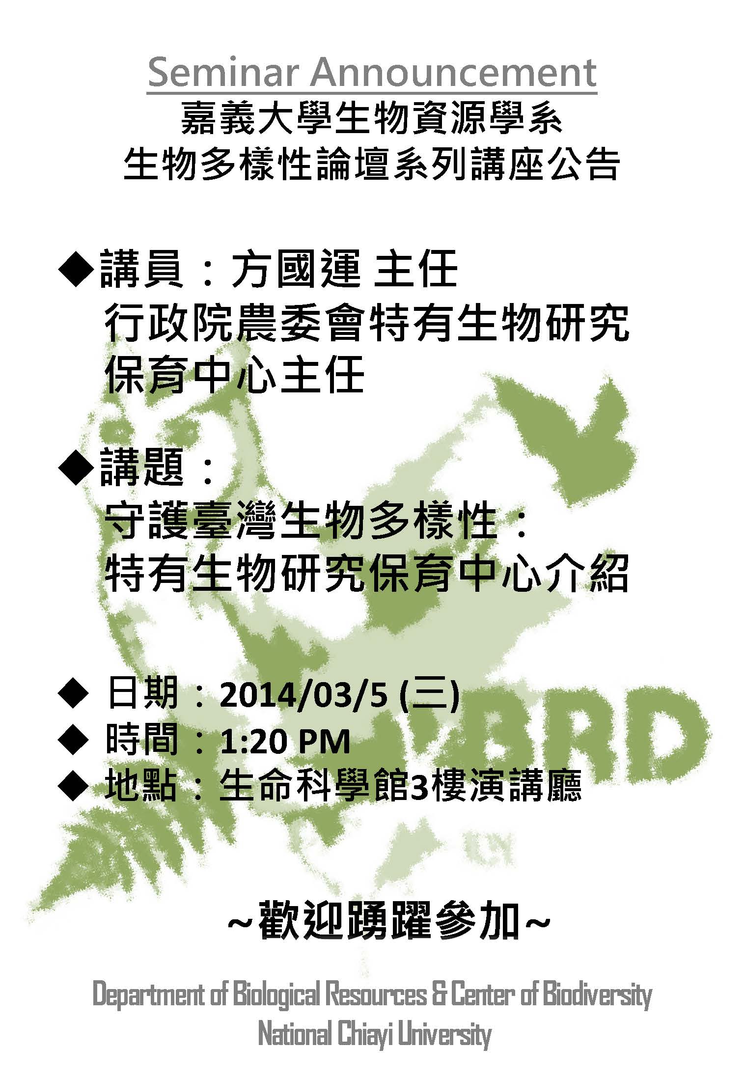 本系102學年度第2學期專題演講-3月5日「守護臺灣生物多樣性:特有生物研究保育中心介紹」,請同學踴躍參加