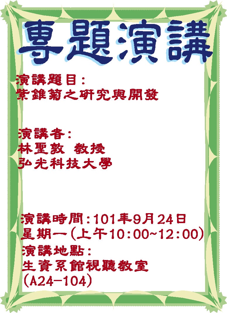 本系101學年度第1學期專題演講-9月24日「紫錐菊之研究與開發」,請同學踴躍參加