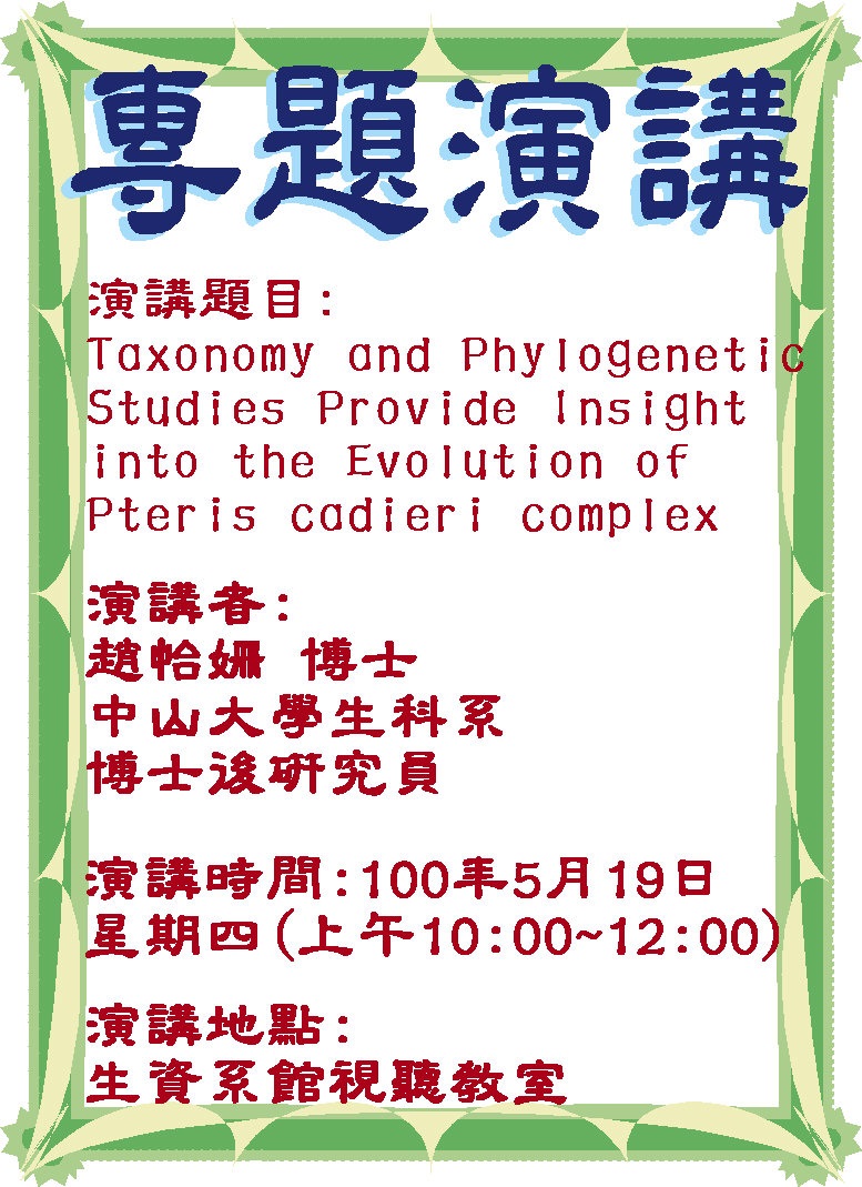 本系100學年度第2學期專題演講-5月19日「Taxonomy and Phylogenetic Syudies Provide Insight into the Evolution of Pteris cadieri complex」,請同學踴躍參加