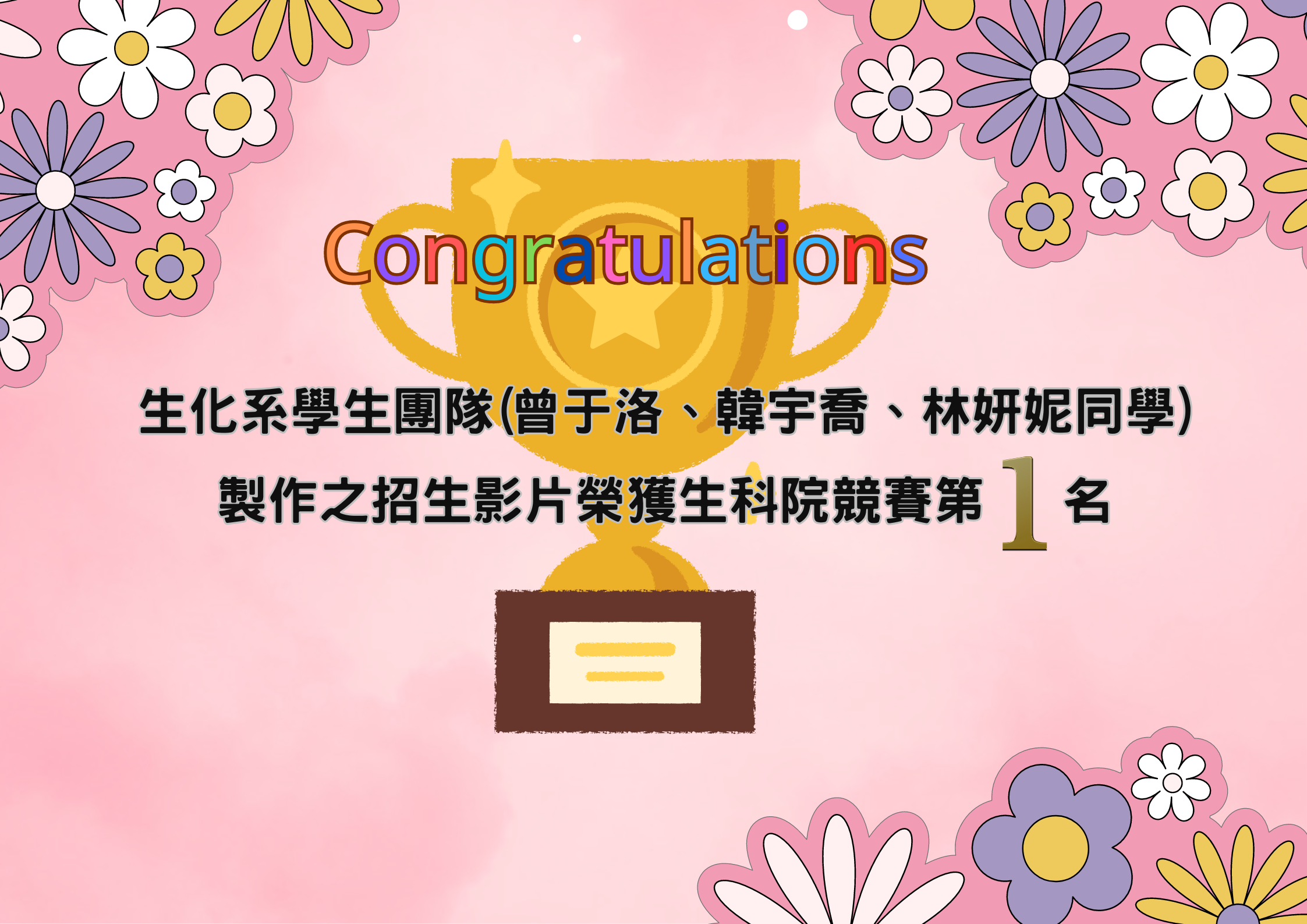本系學生團隊榮獲112學年度生科院招生影片竸賽第1名殊榮