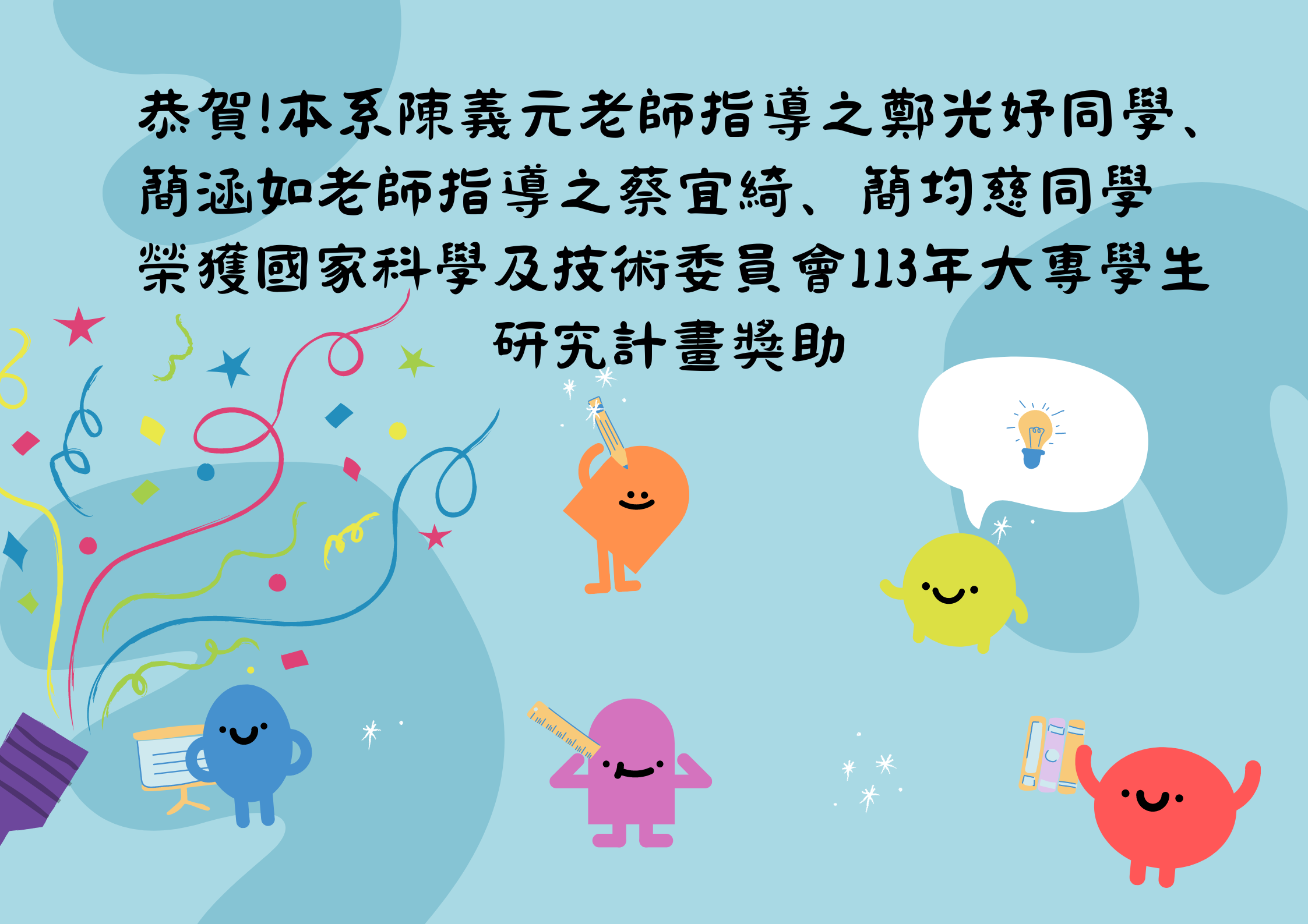 113年榮獲大專生計畫獎助名單(鄭光妤、蔡宜綺、簡均慈同學)