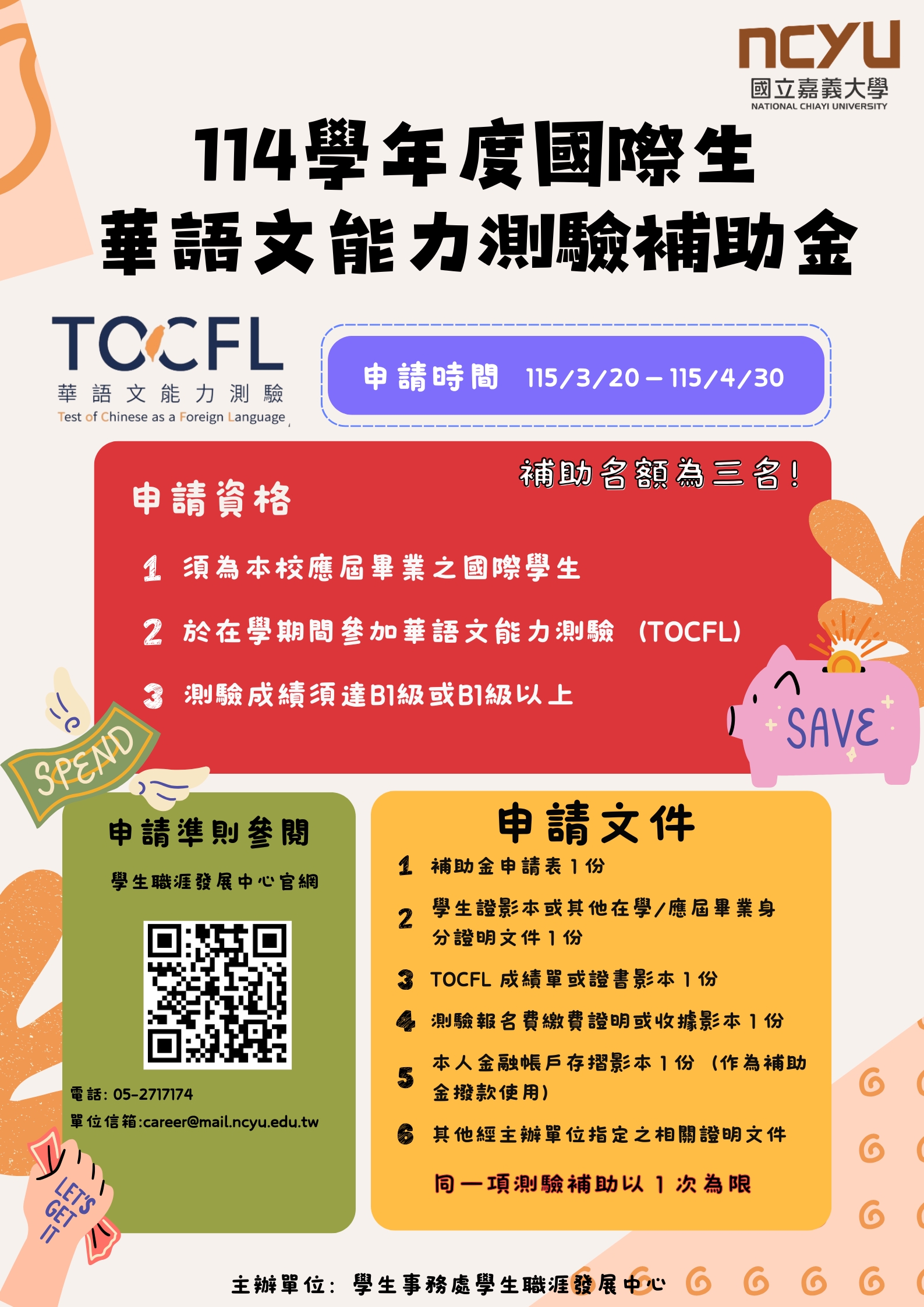 本學年度預計補助 3 名,申請時間自 115 年 3 月 20 日起至 115 年 4 月 30 日止。