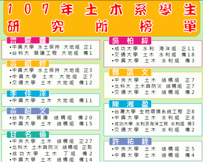 | 2018/07/14 | 107土木系研究所榜單(2) | 土木與水資源工程學系暨研究所 | |