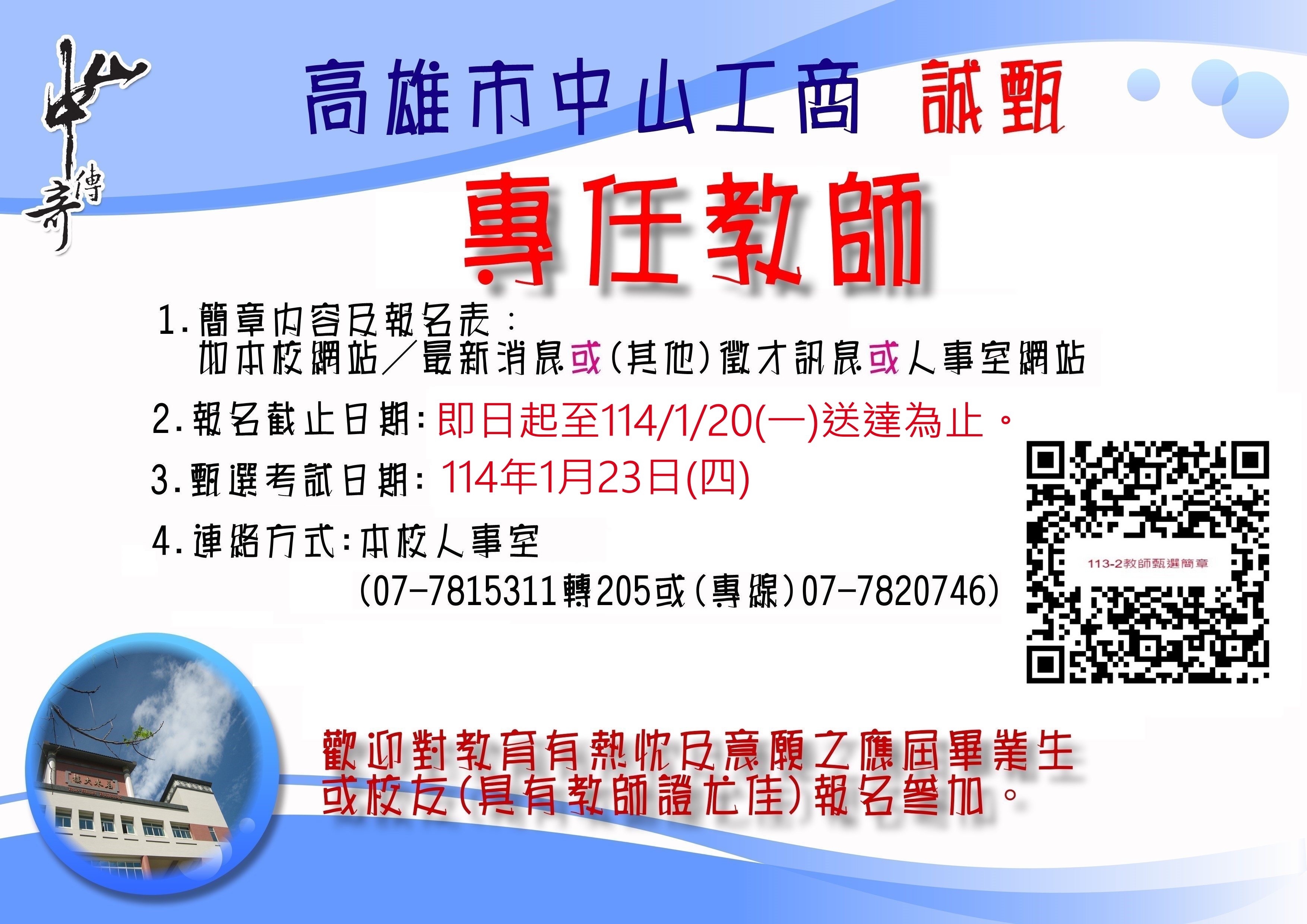高雄市中山工商113學年度第2學期教師甄選
