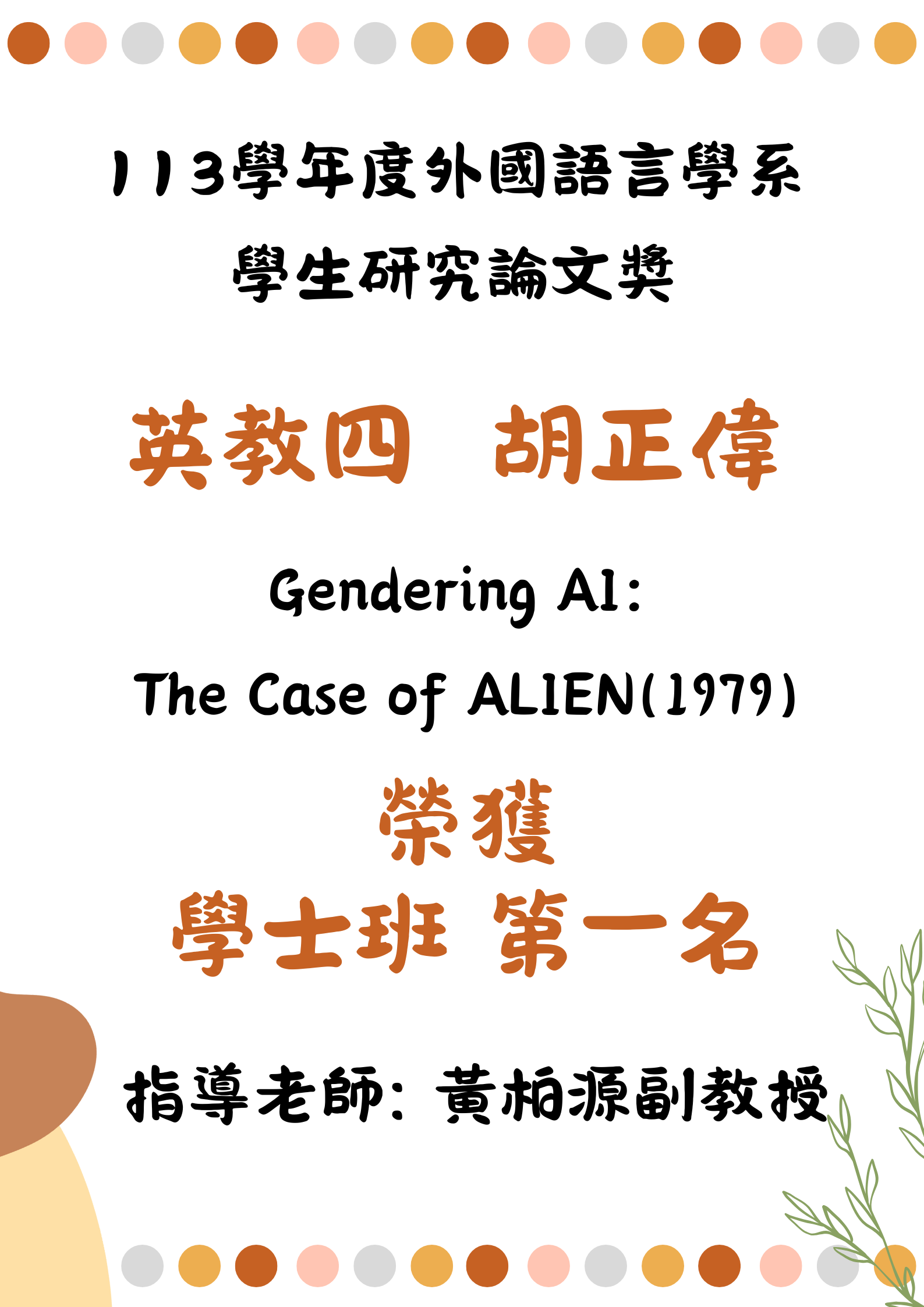 本系胡正偉榮獲113學年度外國語言學系學生研究論文獎