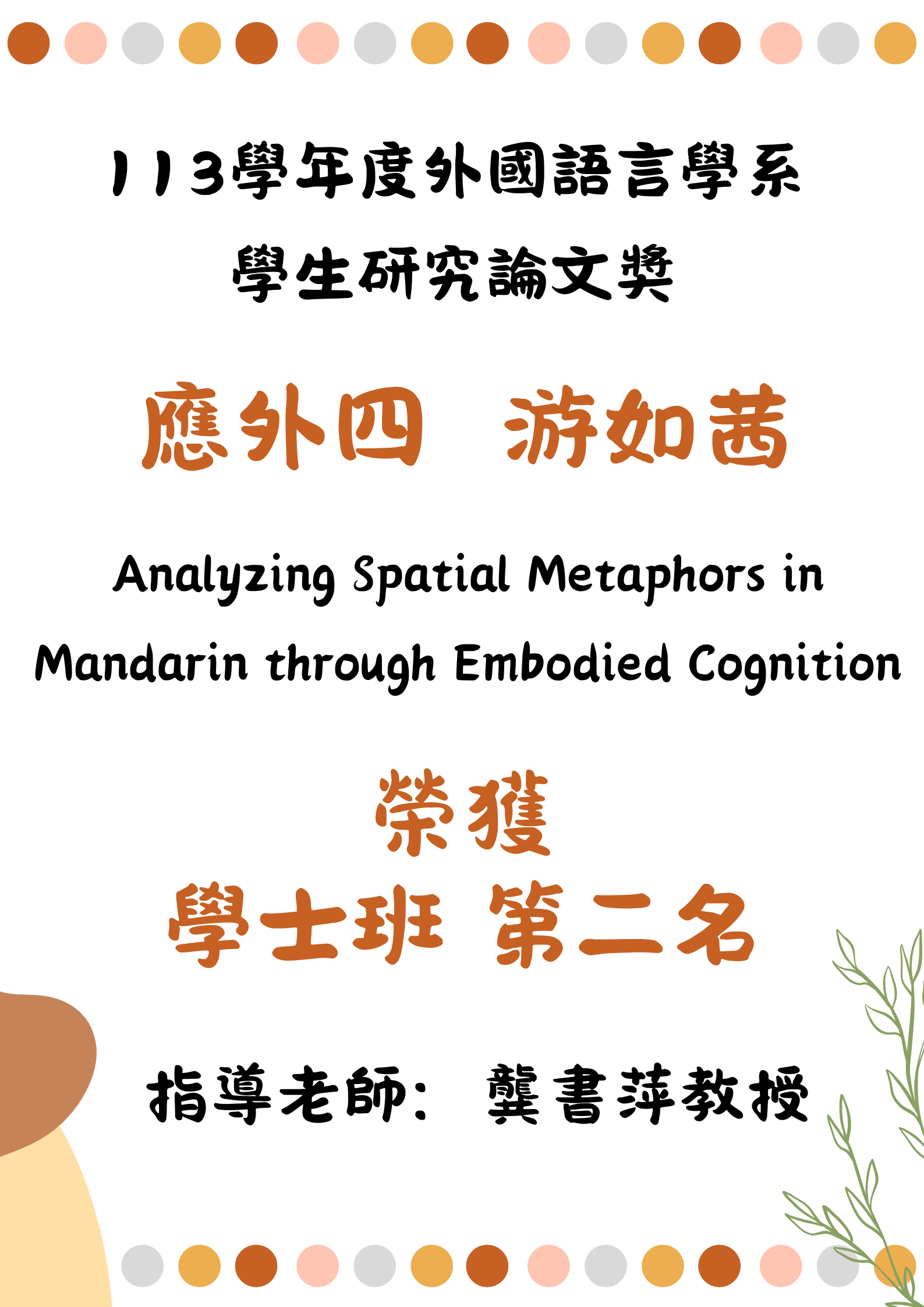 本系游如茜榮獲113學年度外國語言學系學生研究論文獎