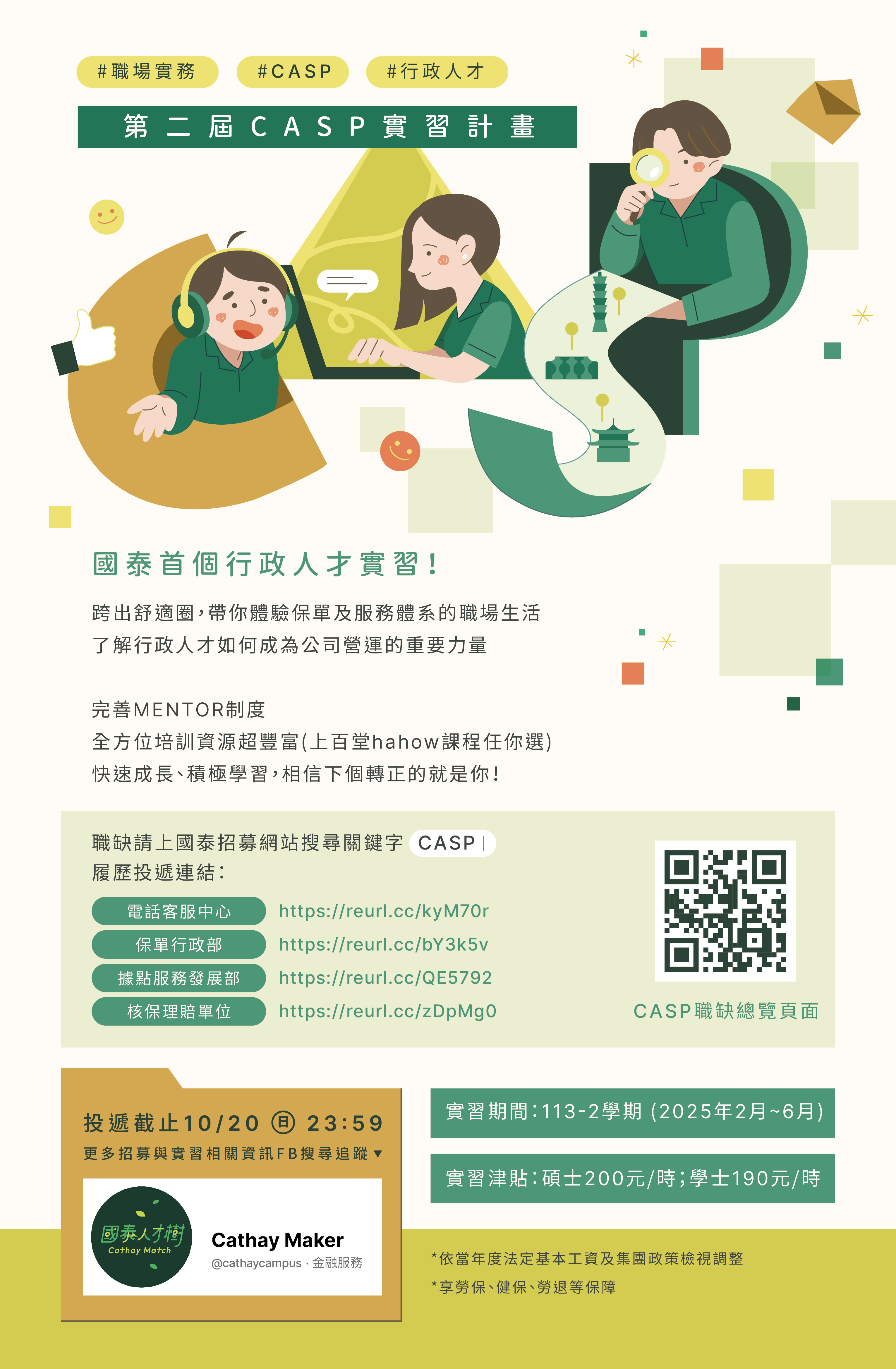 國泰人壽第二屆CASP行政人才實習計畫,履歷投遞至113年10月20日。