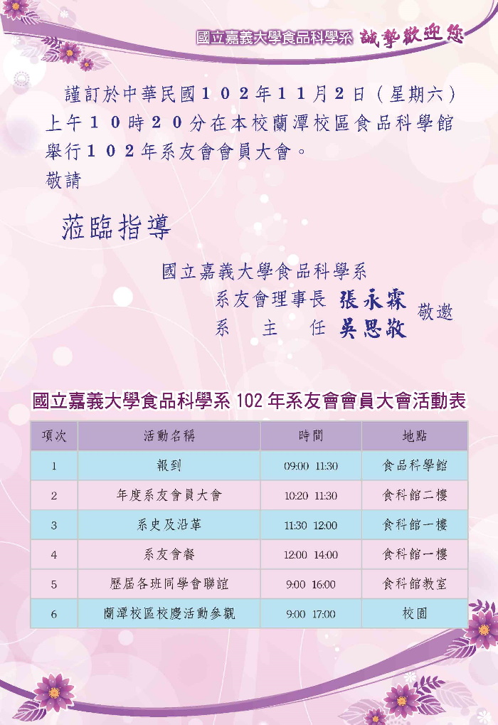 102年度食品科學系系友會員大會「報名表」(102年10月21日前報名)