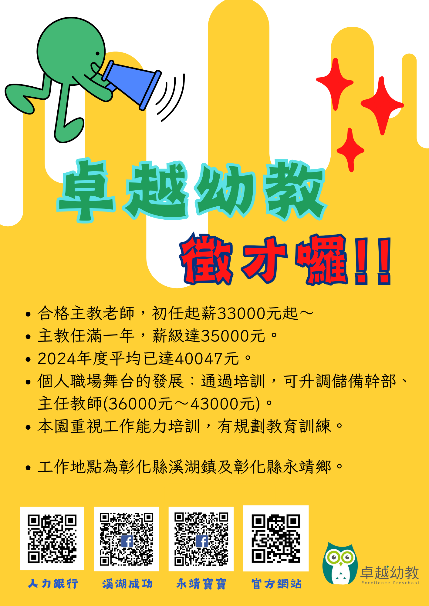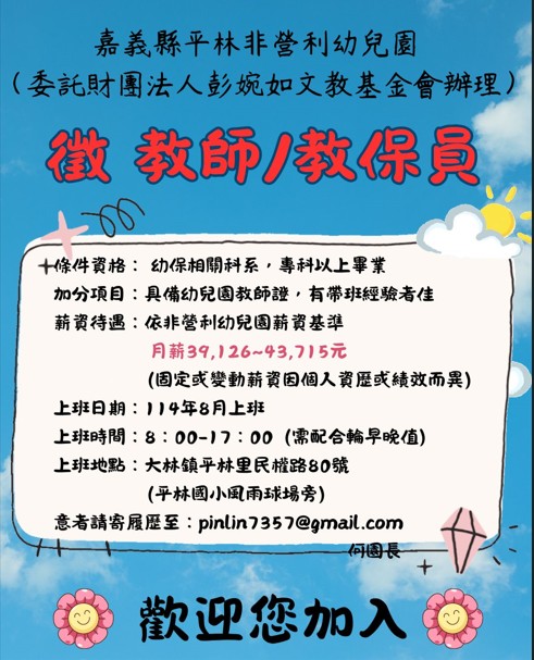 | 2025/08/07 | 嘉義縣平林非營利幼兒園徵才 | 幼兒教育學系暨研究所 | |