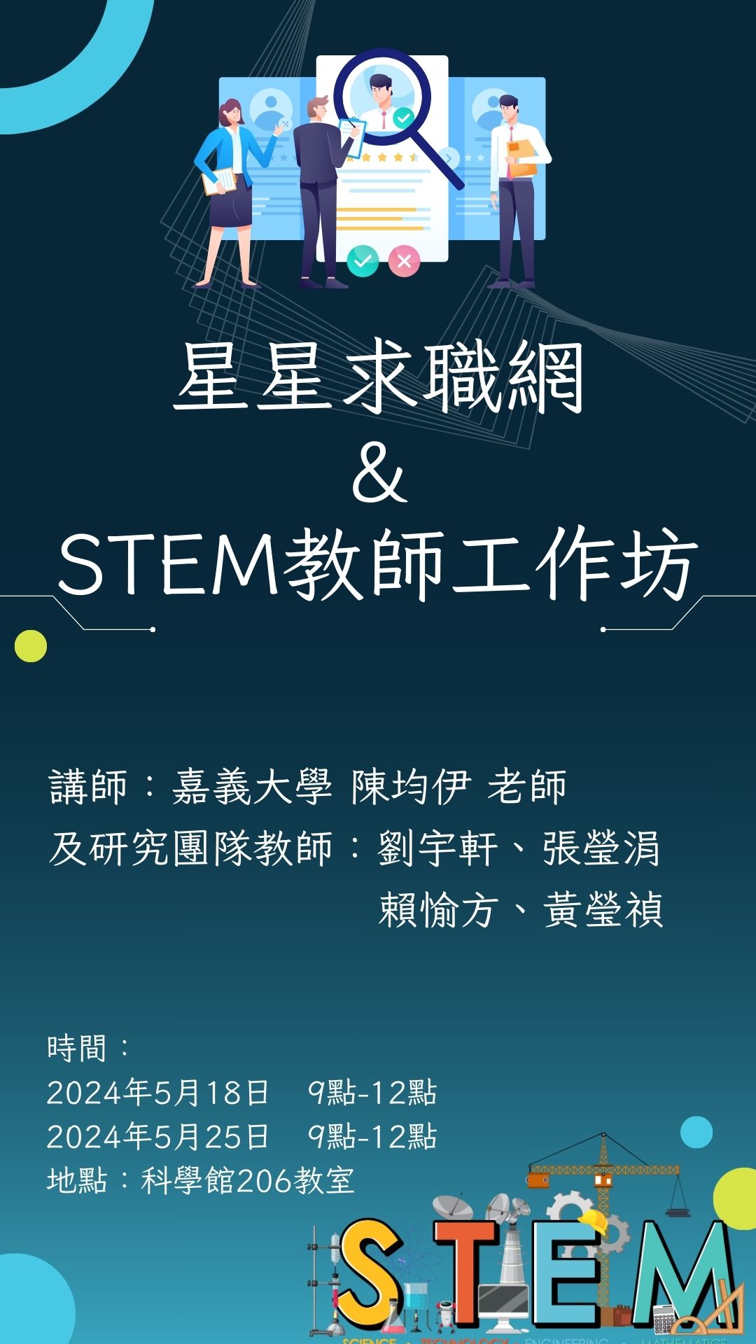 | 2024/04/09 | 星星求職網暨STEM教師培訓工作坊 | 教育學系數理教育碩士班 |