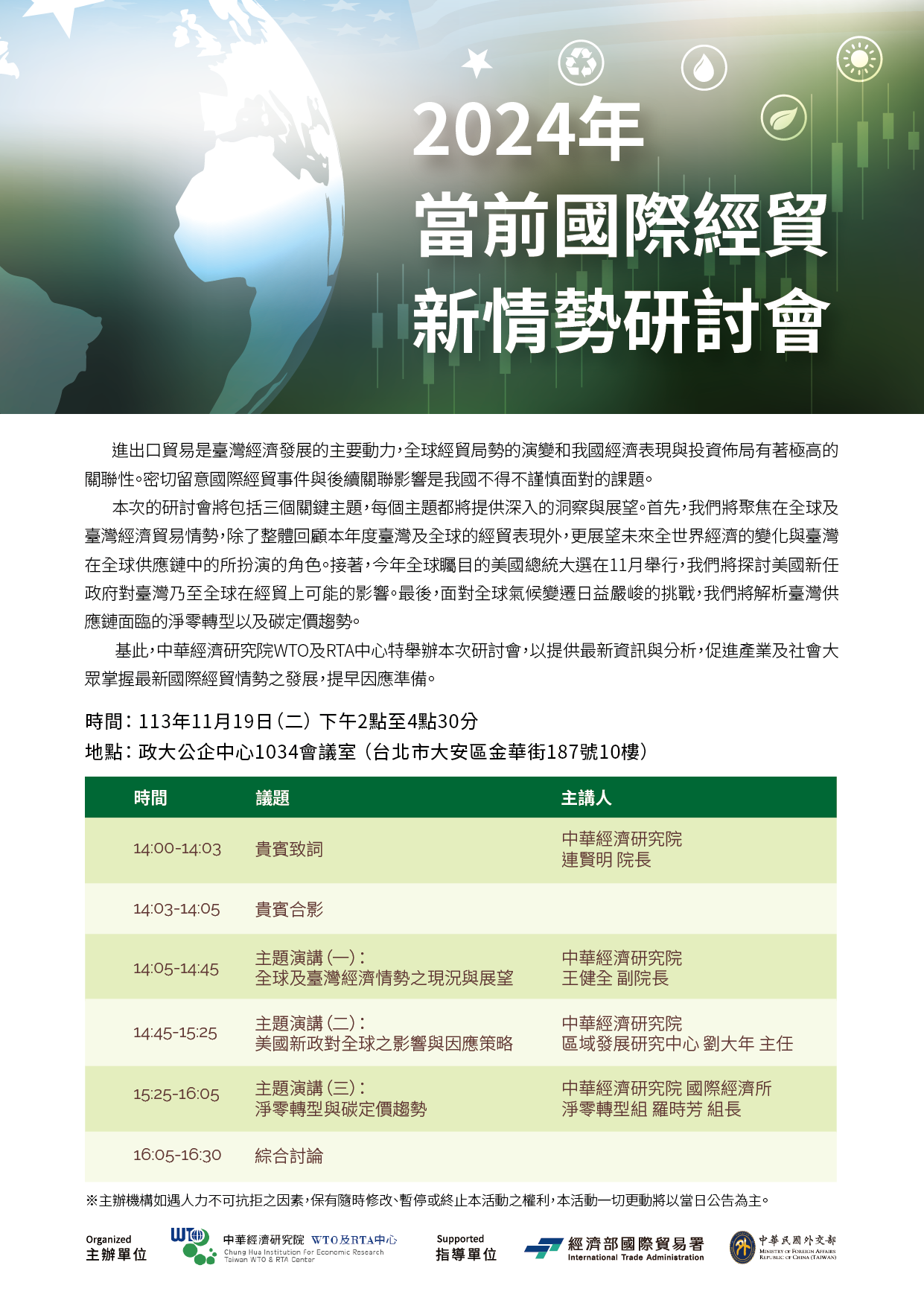 財團法人中華經濟研究院WTO及RTA中心訂於本(113)年11月19日假政大公企中心1034會議室(臺北市大安區金華街187號10樓)舉辦「2024年當前國際經貿新情勢研討會」,敬請踴躍參加,歡迎上網報名。(1131023)