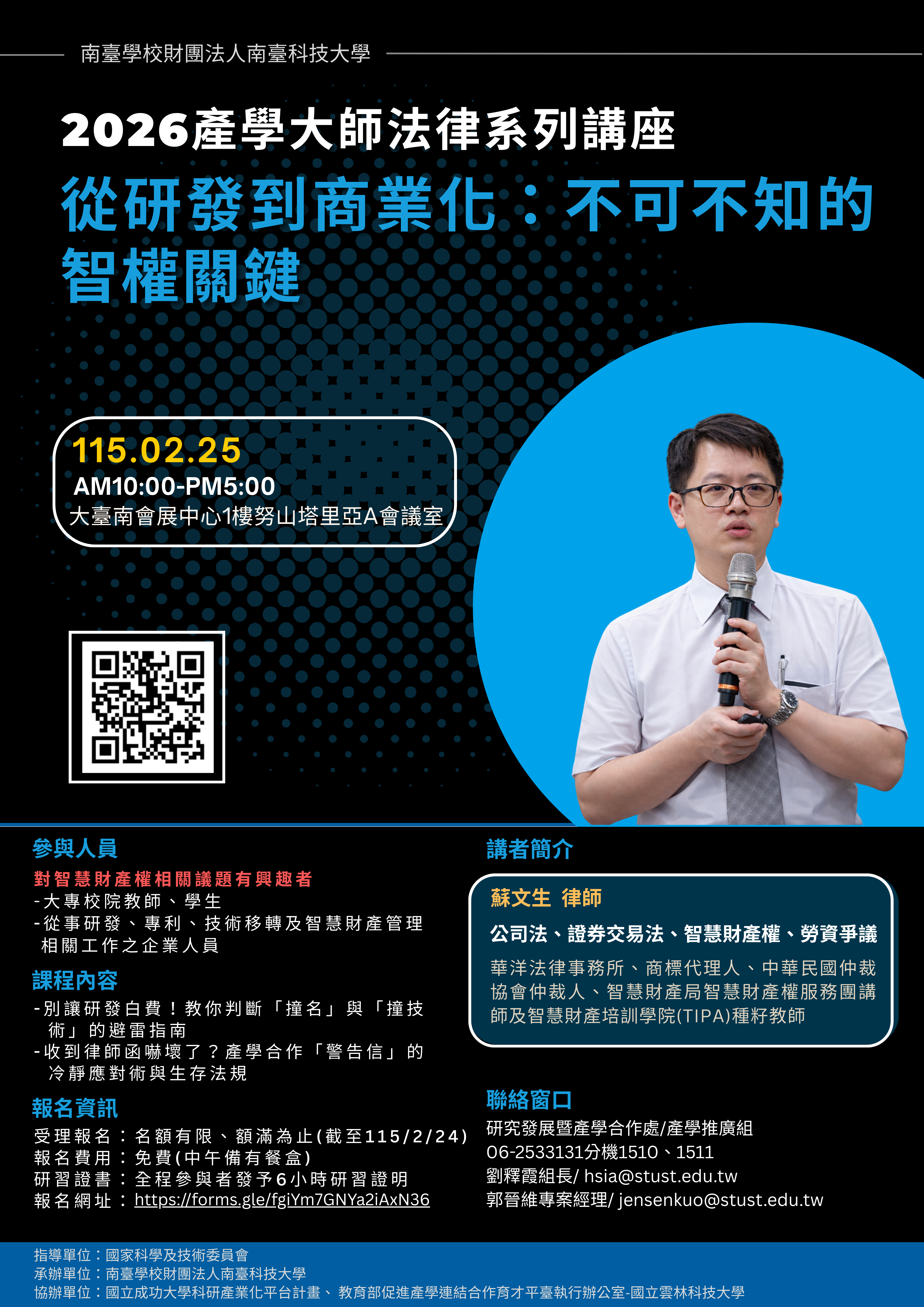 (一)受理報名:名額有限、額滿為止(截至115/02/24)五、聯絡窗口:南臺科技大學研究發展暨產學合作處/產學推廣組06-2533131分機1510、1511 劉釋霞組長/ hsia@stust.edu.tw 郭晉維專案經理/ jensenkuo@stust.edu.tw