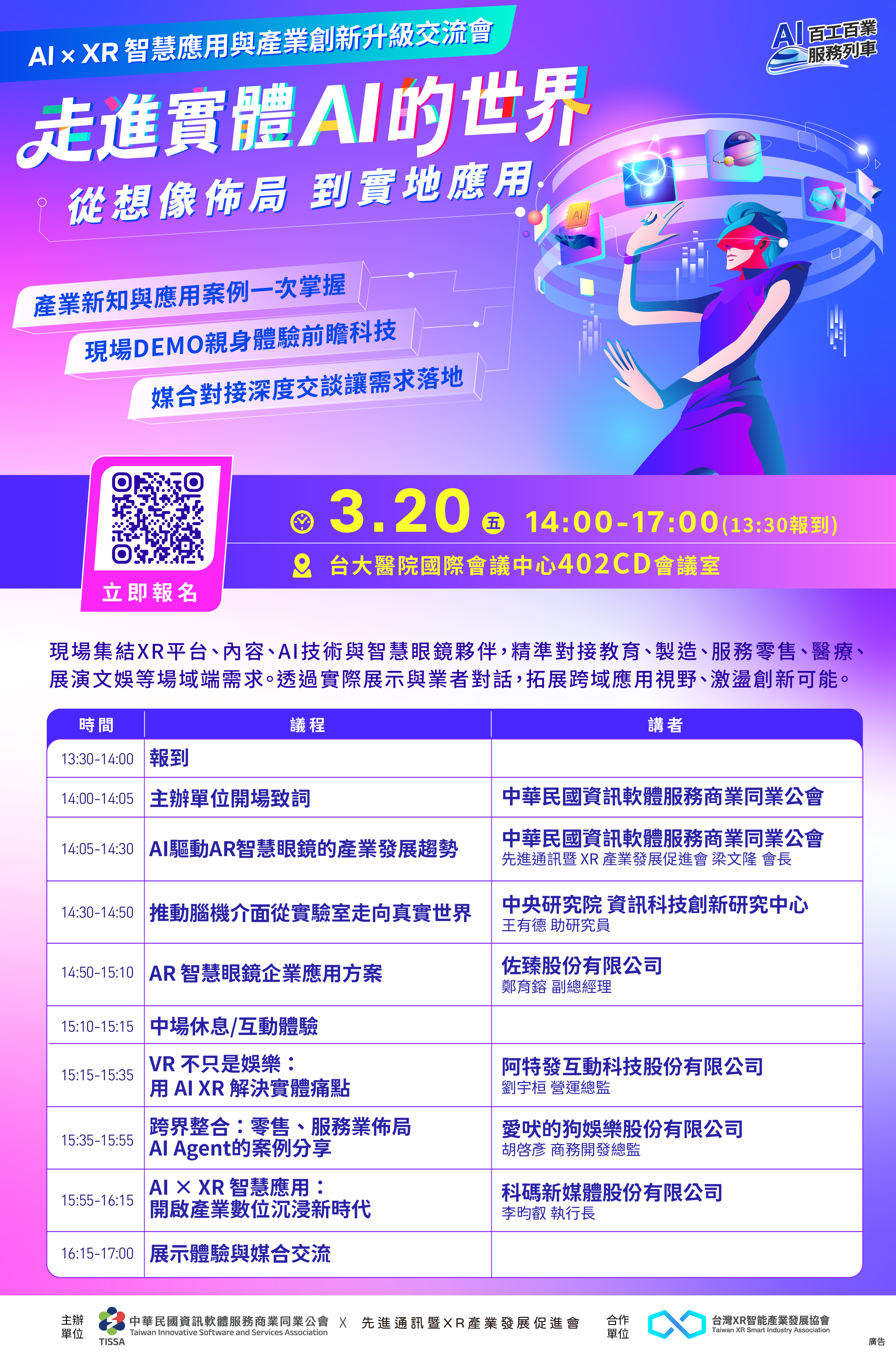 二、本活動訂於115 年 3 月 20 日(五)14:00 至 17:00 假台大醫院國際會議中心 402CD 會議室(台北市中正區徐州路 2 號)舉辦,全程免費,隨函檢附活動議程(附件)及報名網頁。https://forms.gle/xC58GA9A7w43HJUW9