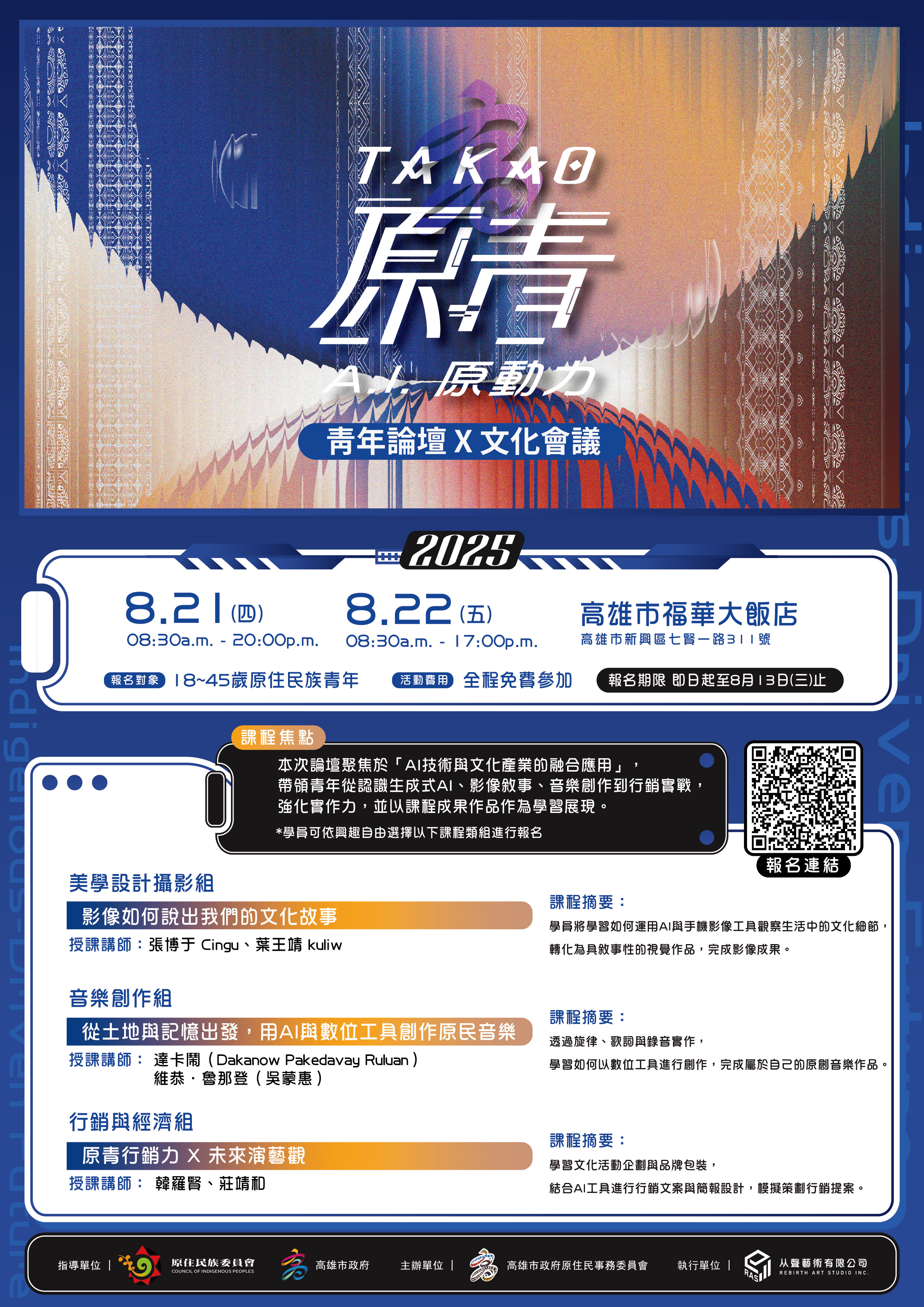 一、為鼓勵原住民青年運用創新科技,透過「AI技術與文化產業」的融合應用,增能自我對於未來進行族語、歌謠、文化記錄與數位敘事創作能力,並藉以培育具備AI素養與族群觀點之原青人才,特為辦理。