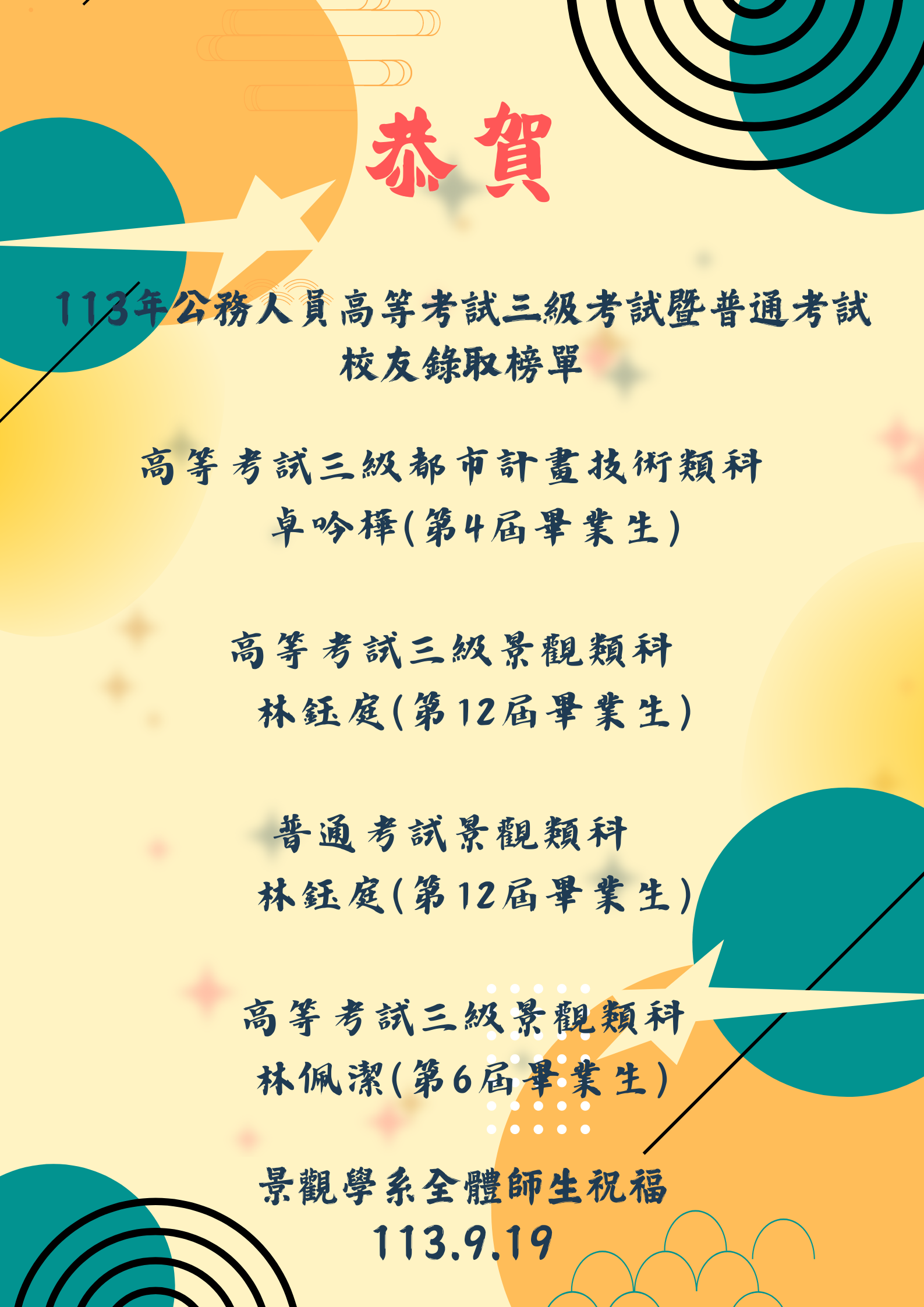 | 2025/05/08 | 113公務人員高等考試三級考試暨普通考試榜單 | 景觀學系 | |