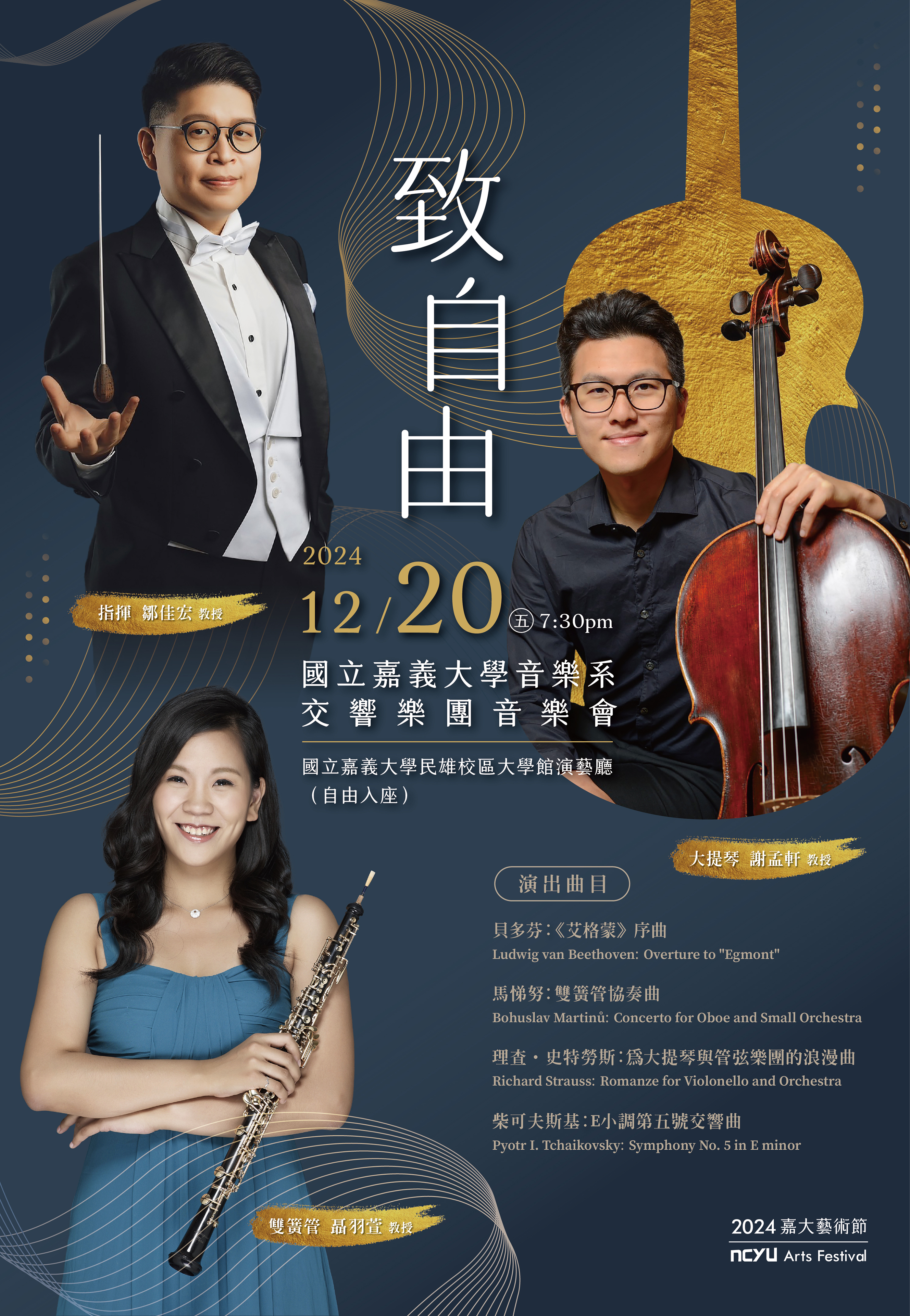 本場演出將由甫獲廣島國際指揮大賽第三名、同時擔任國家交響樂團指揮助理的鄒佳宏指揮嘉大音樂系交響樂團,並邀請到任教於嘉大音樂系的知名雙簧管家聶羽萱與大提琴家謝孟軒同台演出協奏曲。演出曲目包括貝多芬以十六世紀領導荷蘭反抗西班牙統治的英雄為主題所譜寫的艾格蒙序曲,馬悌努抒情而炫技的雙簧管協奏曲,理查‧史特勞斯為大提琴與管弦樂團的浪漫曲,以及柴可夫斯基對於命運深思之作的第五號交響曲,是不容錯過的音樂饗宴,本場次為自由入座。