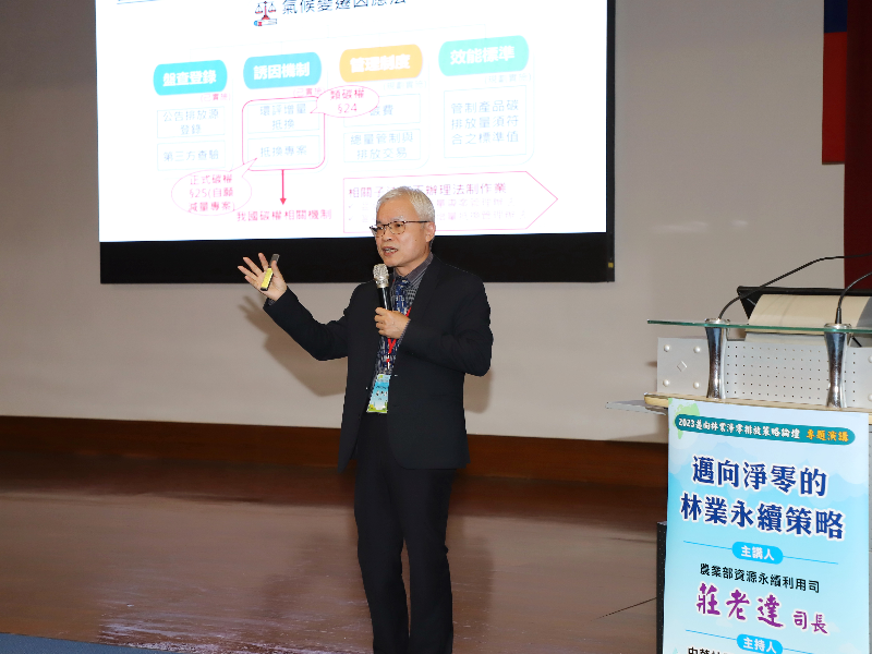 農業部資源永續利用司莊老達司長分享農業淨零排放規劃、森林碳匯推動及林業循環場域與ESG等執行策略及實際成果,並講述目前我國森林碳吸存現況,每年森林碳匯量約近2千2百萬公噸CO2當量。農業部為推動我國森林碳匯,積極增加森林面積、獎勵造林;加強森林經營;提高國產材利用率等,預估2030年可望達到每年增加75.8萬公噸CO2當量。希望我們的努力能留給下一代永續的農業,淨零永續韌性共榮。