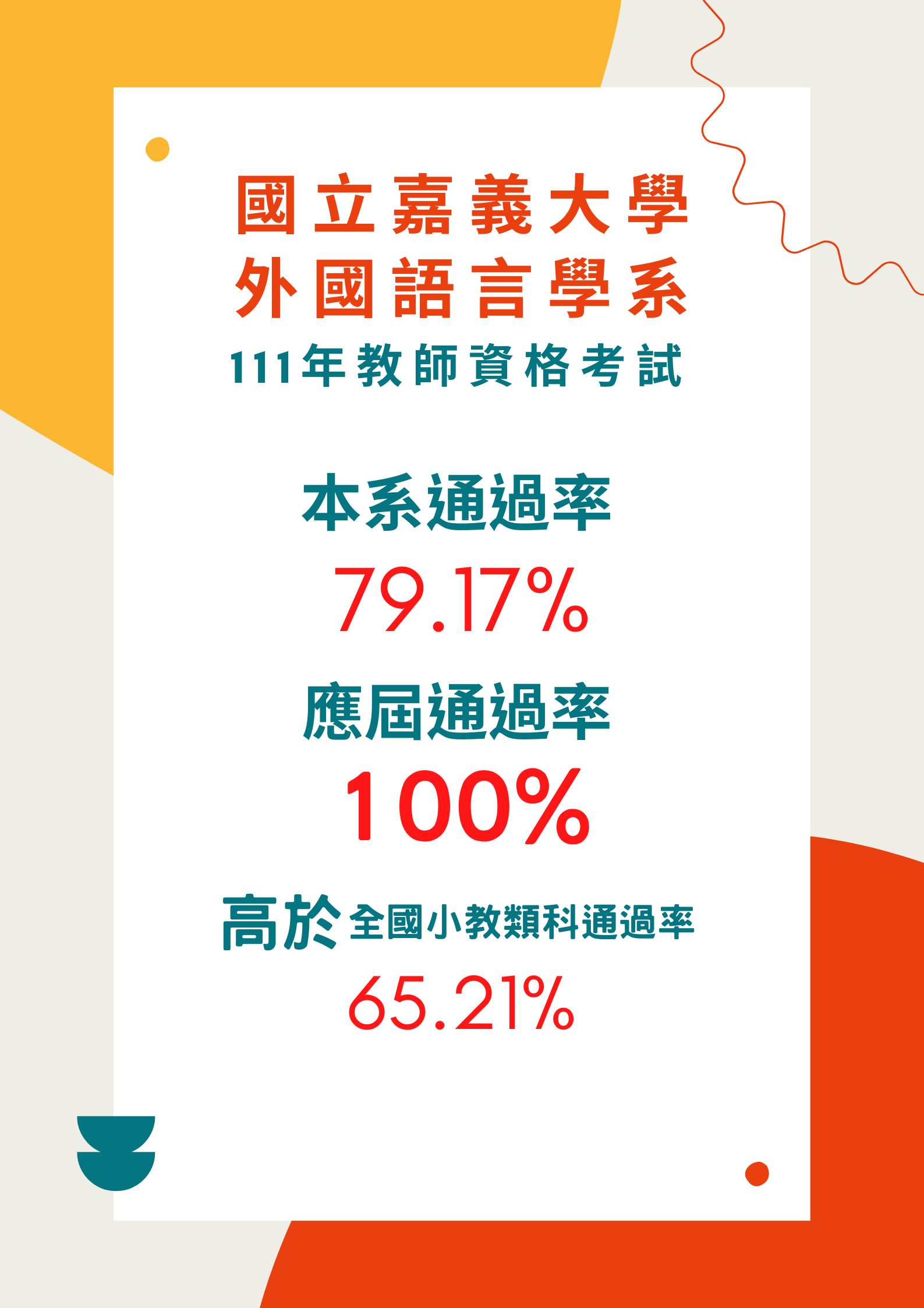 The passing rate of the 111-year Teacher Qualification Examination of the Department of Foreign Languages is 100%, and the performance is excellent.