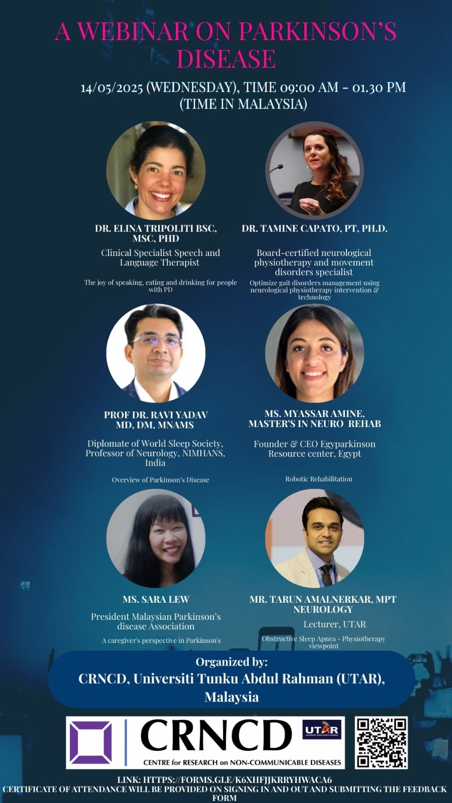 A webinar on Parkinson's disease organized by Centre for Research on Non-Communicable Diseases (CRNCD), Universiti Tunku Abdul Rahman (UTAR), Malaysia.