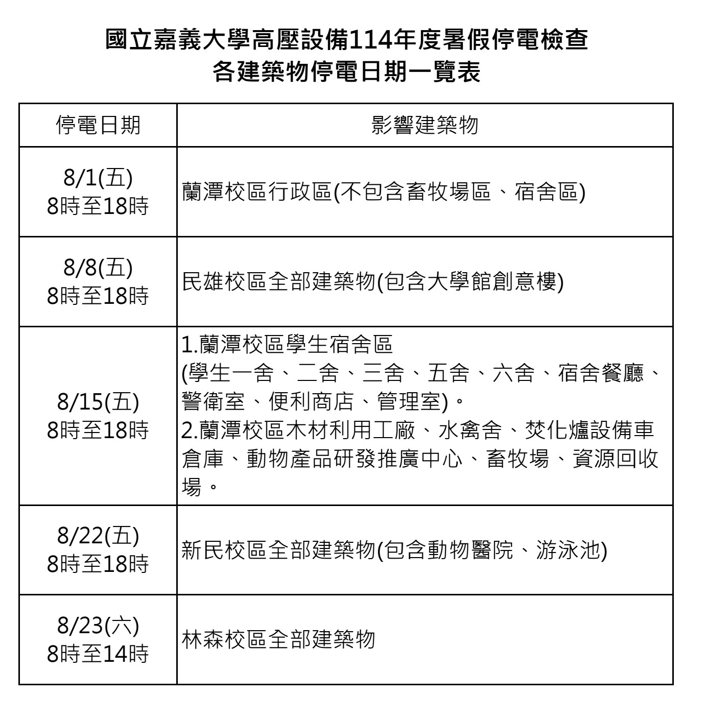 二、本校高壓設備114年度暑假停電檢查各建築物停電日期一覽表如附件,停電日期如有修改依總務處營繕組通知。