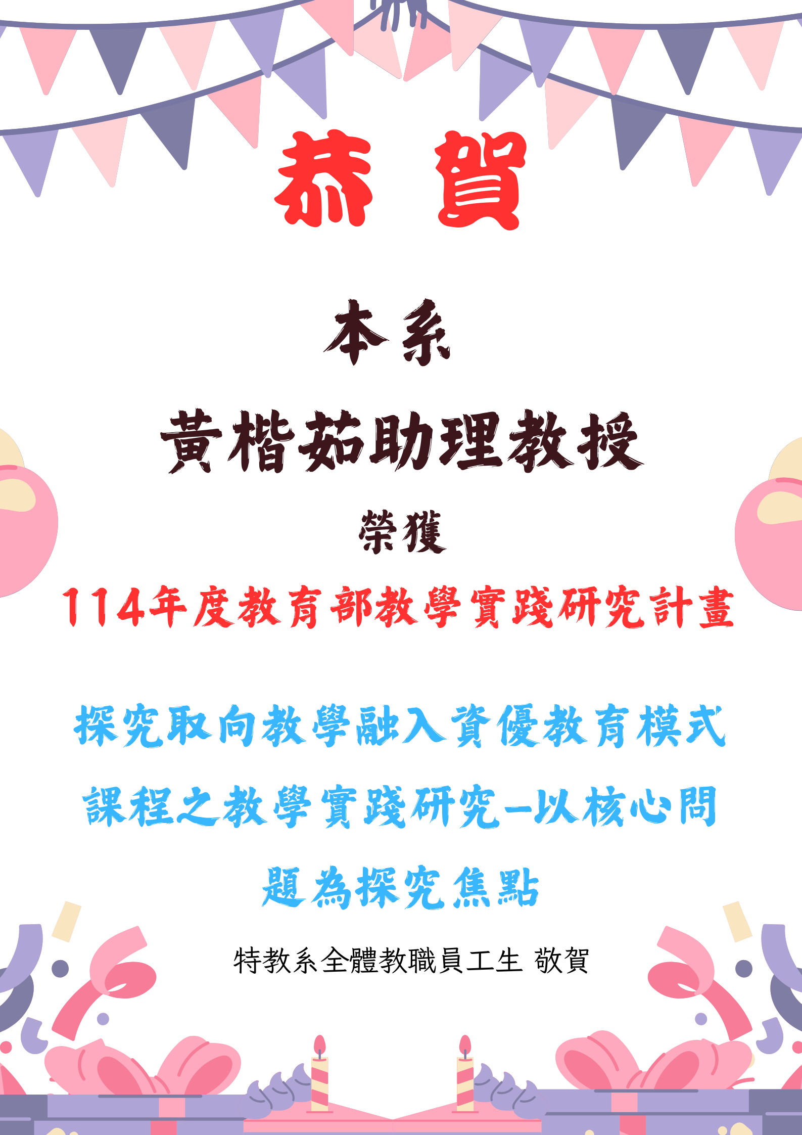 【恭賀】本系黃楷茹助理教授通過114年度教育部「教學實踐研究計畫」
