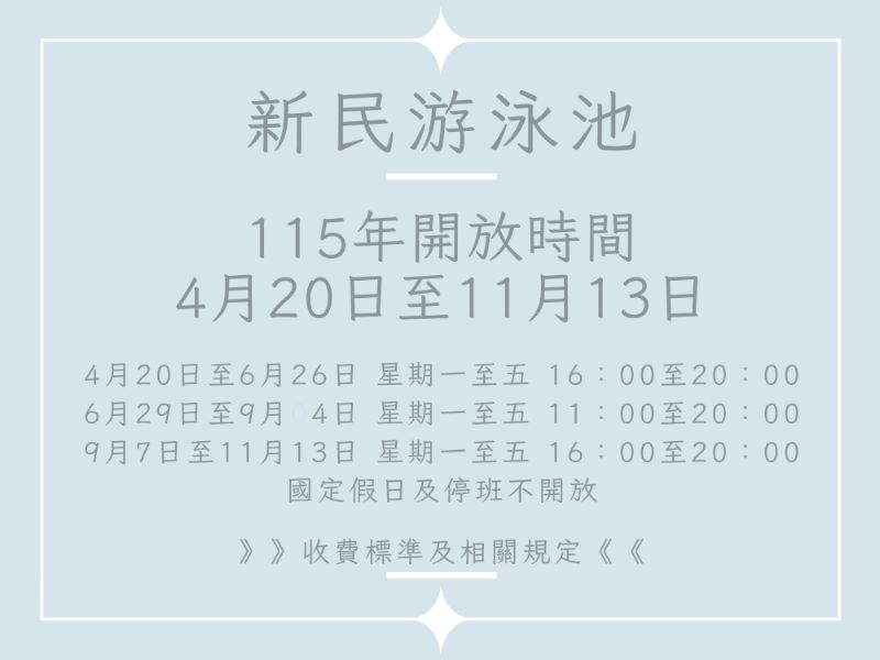Apr. 20場地公告 🆕新民游泳池開放公告