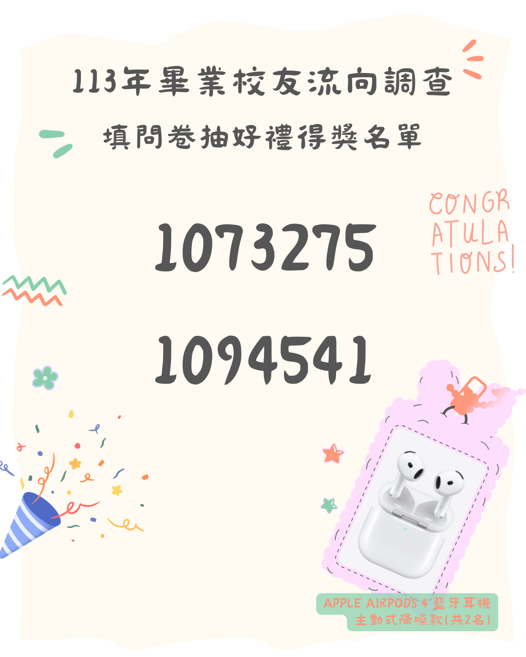 113年畢業校友流向調查填問卷抽好禮獲獎名單