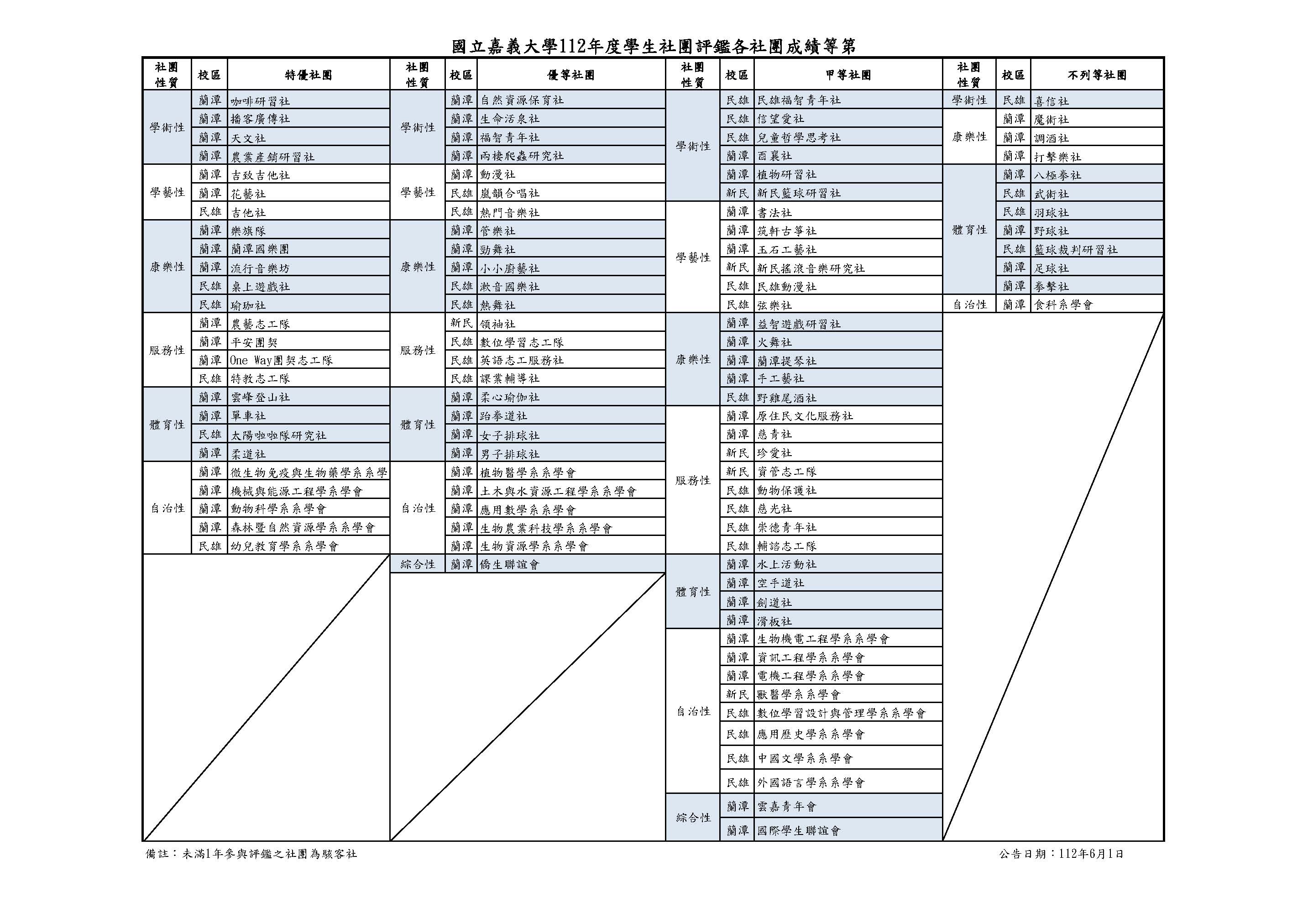 | 2023/06/05 | 【成績】國立嘉義大學112年度學生社團評鑑各社團成績等第 | 民雄學務組 | |