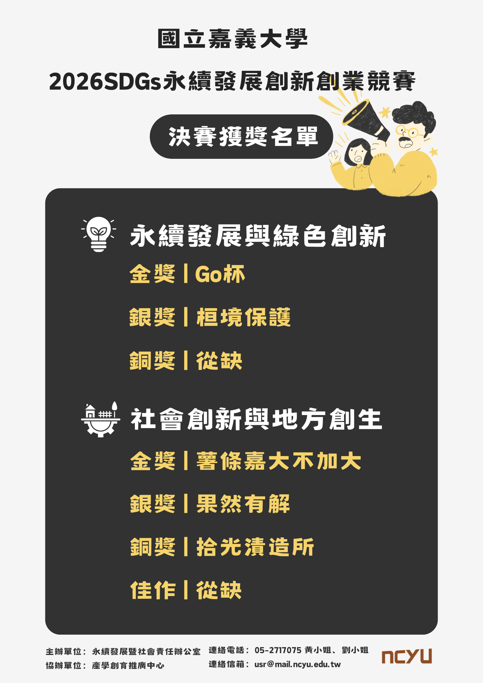 請各獲獎團隊配合出席領獎,並留意後續相關通知。
