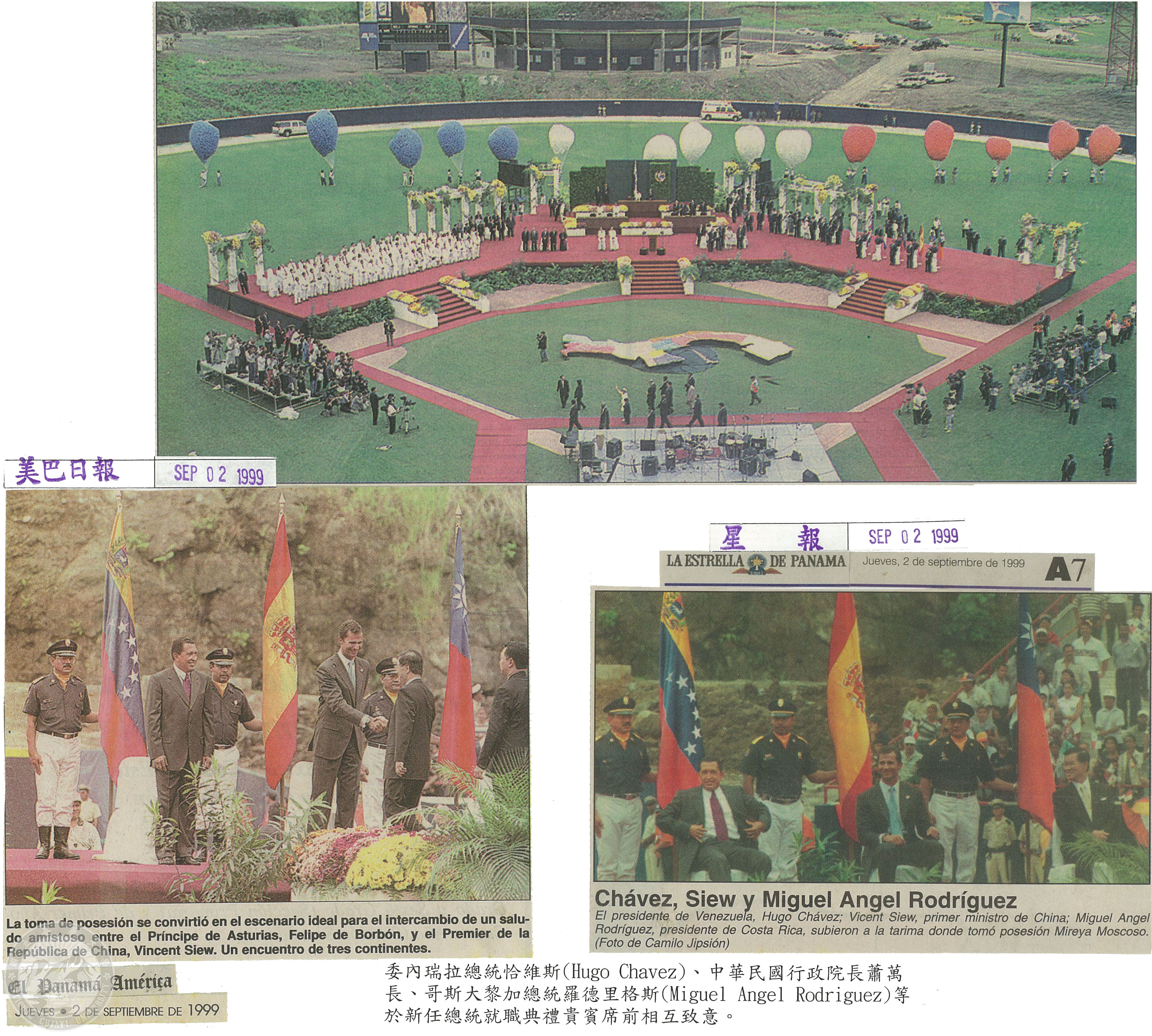 委內瑞拉總統恰維斯(Hugo Chavez)、中華民國行政院長蕭萬長。哥斯大黎加為總統羅德里格斯(Miguel Angel Rodriguez)等於新任總統就職典禮貴賓席前相互致意。 |