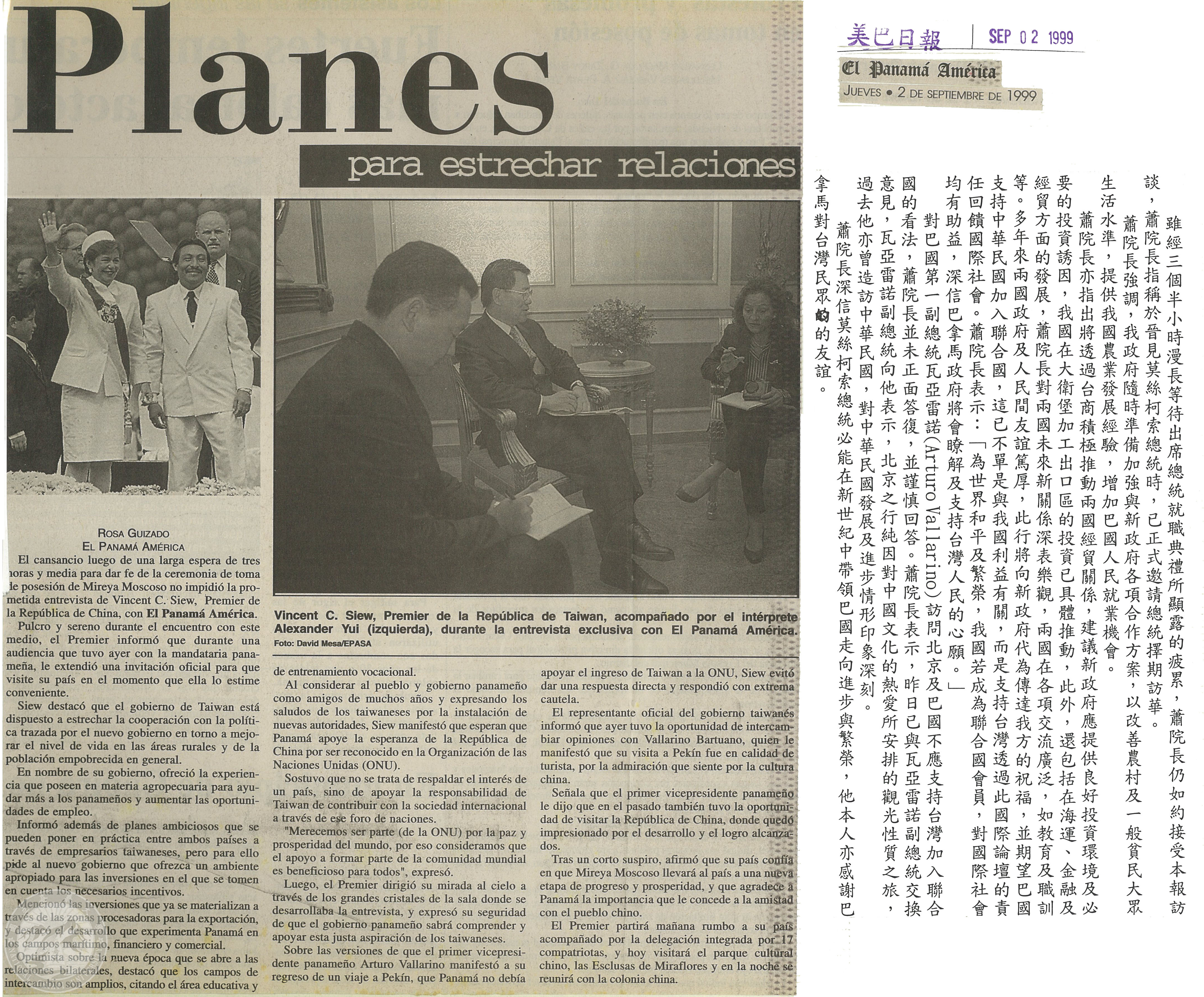 中華民國行政院蕭院長伉儷率特使團慶賀巴拿馬新任總統莫斯柯索(Mireya Moscoso)就職典禮相關報導剪報專輯 |