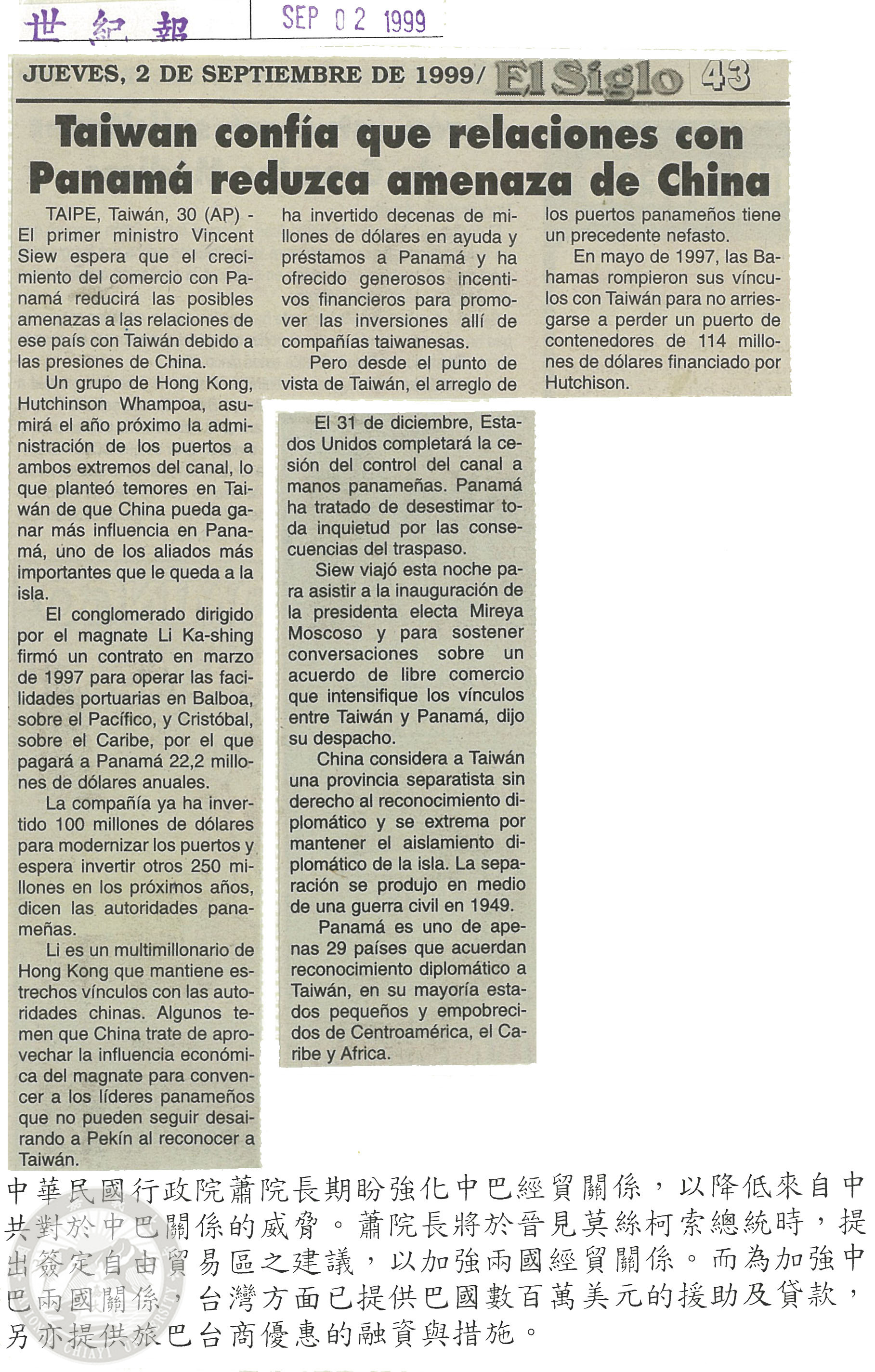 中華民國行政院蕭院長伉儷率特使團慶賀巴拿馬新任總統莫斯柯索(Mireya Moscoso)就職典禮相關報導剪報專輯 |
